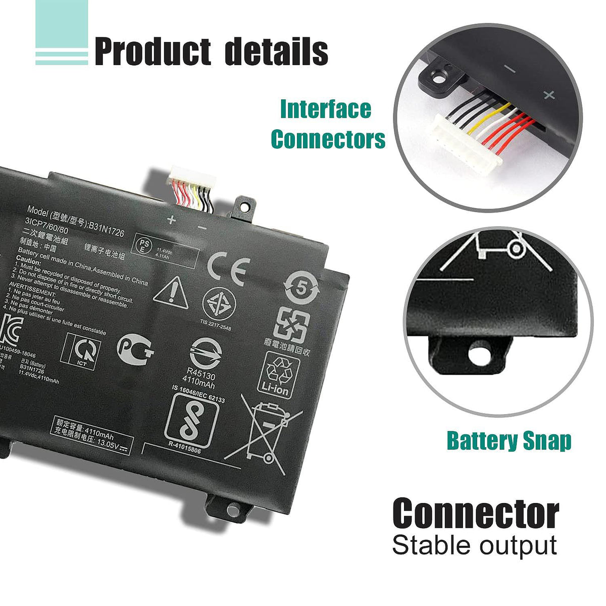 Q: What are the voltage and capacity specifications of the B31N1726 battery?A: The B31N1726 battery has a voltage of 11.4V and a capacity of 48Wh (4240mAh), which are crucial specifications to match with your laptop's requirements for optimal functionality.