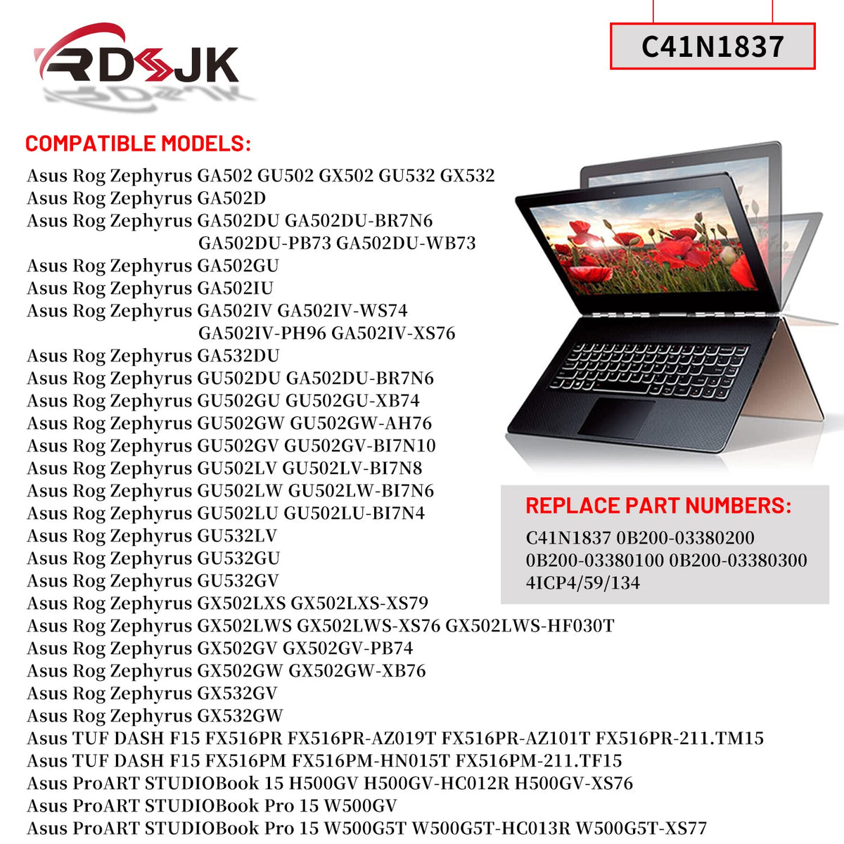 Q: What laptops are compatible with the C41N1837 Laptop Battery?A: The C41N1837 Laptop Battery is compatible with various Asus ROG Zephyrus models including GA502DU, GA502GU, GA502IV, GU502DU, GU502GU, GU532GU, GX502GV, and many more. It also fits Asus TUF DASH F15 and ProART STUDIOBook series. Always check your specific model to ensure compatibility.