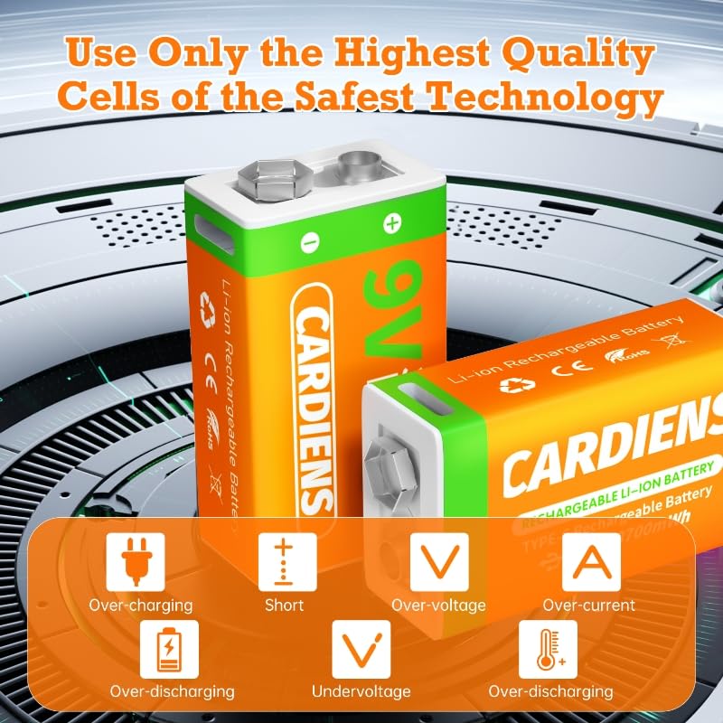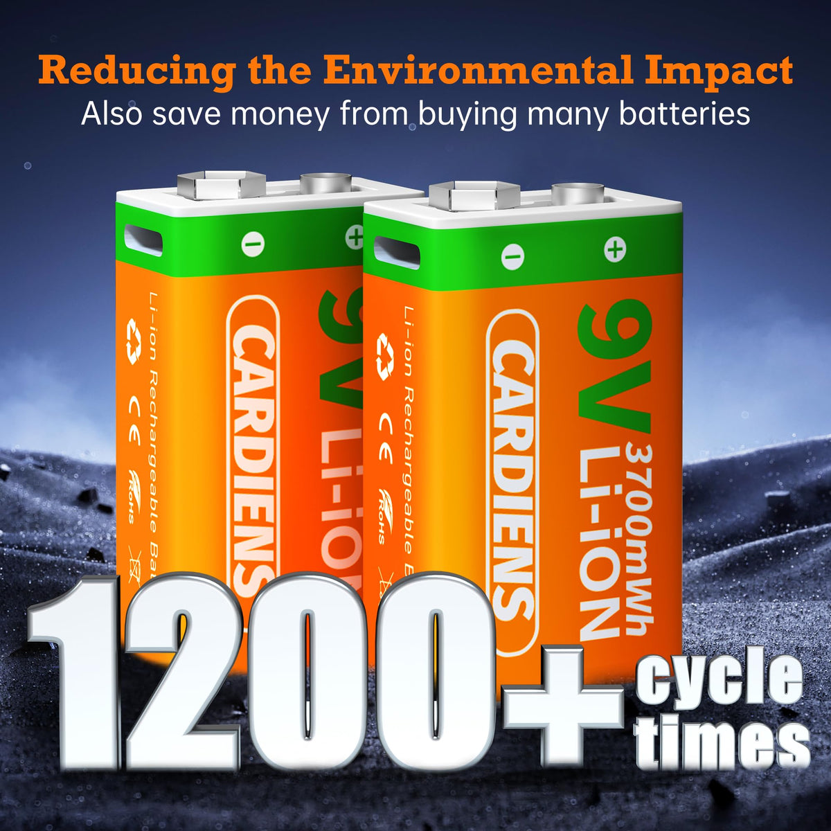 Need To Buy Batteries Often And Spend A Lot Of Money On Them? How Do You Dispose Of Dead Batteries? How About To Using Cardiens Rechargeable Batteries To Solve These Problem? Here Is The Reason Why You Should Choose Cardiens! 1. Other 9V Rechargeable Batteries Usb C Comes With Their Own Charger, You Need To Buy An Extra Charger And Keep It With You, But Cardiens Includes A 2-In-1 Usb-C Charging Cable, No Extra Parts Are Needed, And It Can Be Charged With Any Usb Port. Even You Can Use Your Own Usb Cable. 2. 3700 Mwh Lithium 9V Battery, And Others Is 1300, You Can Use The Batteries For A Long Time. 3. The Factory Was Established In 2006, And It Has A Complete Set Of Product Quality Assurance System Design And Autonomous Research And Development Capabilities. Don'T Worry About The 9 Volt Batteries 2 Pack'S Safety. 4. The 9Volt Batteries 2 Pack Can Be Recharged 1200+ Times, The Usb Batteries 9 Volt Will Still Save You Tons Of Money And Time. It Also Reduce The Dead Batteries That Get Tossed Into Landfills. 5. Indicator Status: The Green Indicator Blinks When Charging, And The Green Indicator Keeps On After Charging Is Complete. Product Information: Operating Voltage: 9 V Constant Voltage Battery Energy: 3700Mwh Charging Voltage: 5V Standard Charging Time: 120 Mins Fast Charging Time: 90 Mins Cycle Life: 1200+ Operating Temperature: -20-40?