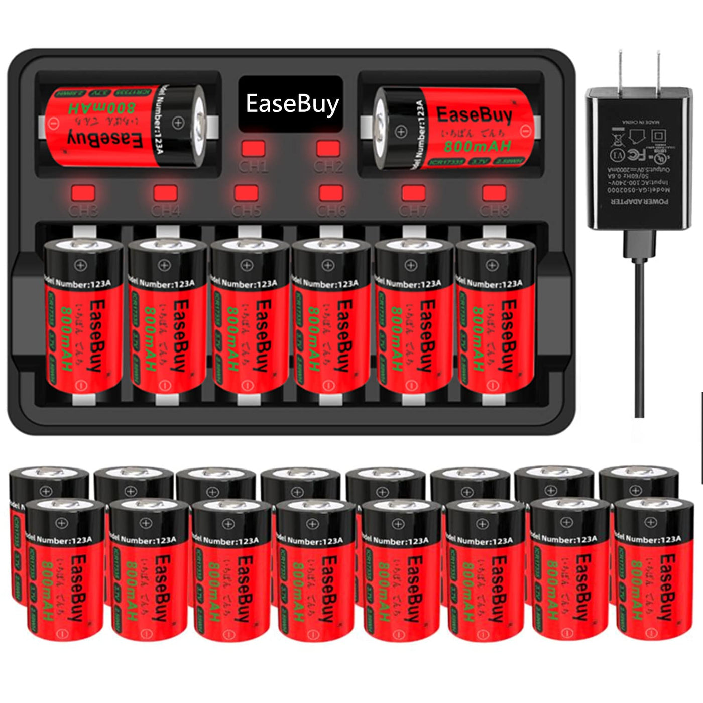 * Easebuy Cr123A Rechargeable Batteries For Arlo Hd Camera And More Easebuy Cr123 Rechargeable Arlo Batteries Are An Eco-Friendly Alternative That Will Help You To Reduce The Cost Of Buying New Batteries Every Now And Then. These Batteries Produce Less Waste Than Disposable Batteries Because They Can Be Recharged With Our Battery Charger And Reused Repeatedly. Arlo Batteries Can Be Fully Charged Up To 600 Times. The Reusability Offers Significant Savings Over Non-Rechargeable Batteries. Very Convenient Usage And A Drop-In Replacement. Also Saves Our Environment By Preventing The Waste Of Non-Rechargeable Lithium Cr123A Batteries. * Long-Lasting Performance Retain Up To 70% Of Original Capacity After 600 Full Charge And Discharge Cycles, Equivalent 250Pcs Non-Rechargeable 3V 1500Mah Batteries. * Easebuy 123A Rechargeable Battery: Replace Non-Rechargeable 3V Battery Battery Size: Icr17335(123A Size) Battery Type: 3.7V Arlo 123A Rechargeable Batteries, Ul And Un Certified Capacity:800Mah Weight:22G * 123A Batteries Charger High Performance - Charge 8 Batteries Simultaneously, Each Of The Four Batteries Monitors And Charges Independently. Note:Please Do Not Use This Charger To Charge Non-Rechargeable 3V Cr123A Batteries. * What'S In The Box: 16 X Rechargeable Batteries 1 X 8-Port Battery Chagrer 1 X Battery Chagrer Adapter 1 X Usb Charger Cable 1 X User Manual