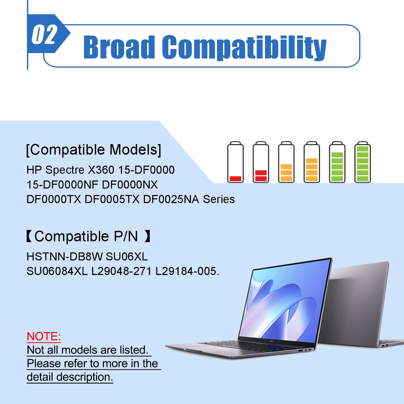 Q: What laptop models are compatible with the Dentsing SU06XL battery?A: The Dentsing SU06XL battery is compatible with various HP Spectre x360 models, including the 15-DF0033DX, 15-DF1033DX, and other models in the HP Spectre X360 15 Convertible PC Series. Always check your laptop's back cover for the battery model to ensure compatibility.