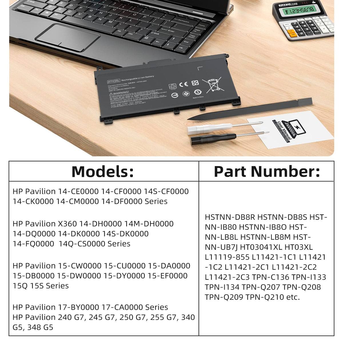 Q: What laptops are compatible with the DREAMME HT03XL Battery?A: The DREAMME HT03XL Battery is compatible with several HP Pavilion models, including the 14-CE, 14-DF, 14-CF, 15-CS, 15-DA, 15-DB, 15-DW, 15-CU, 15-CW, as well as the 17-by and 17-CA series. It also supports part numbers such as HT03XL, HSTNN-LB8L, HSTNN-DB8R, and others.
