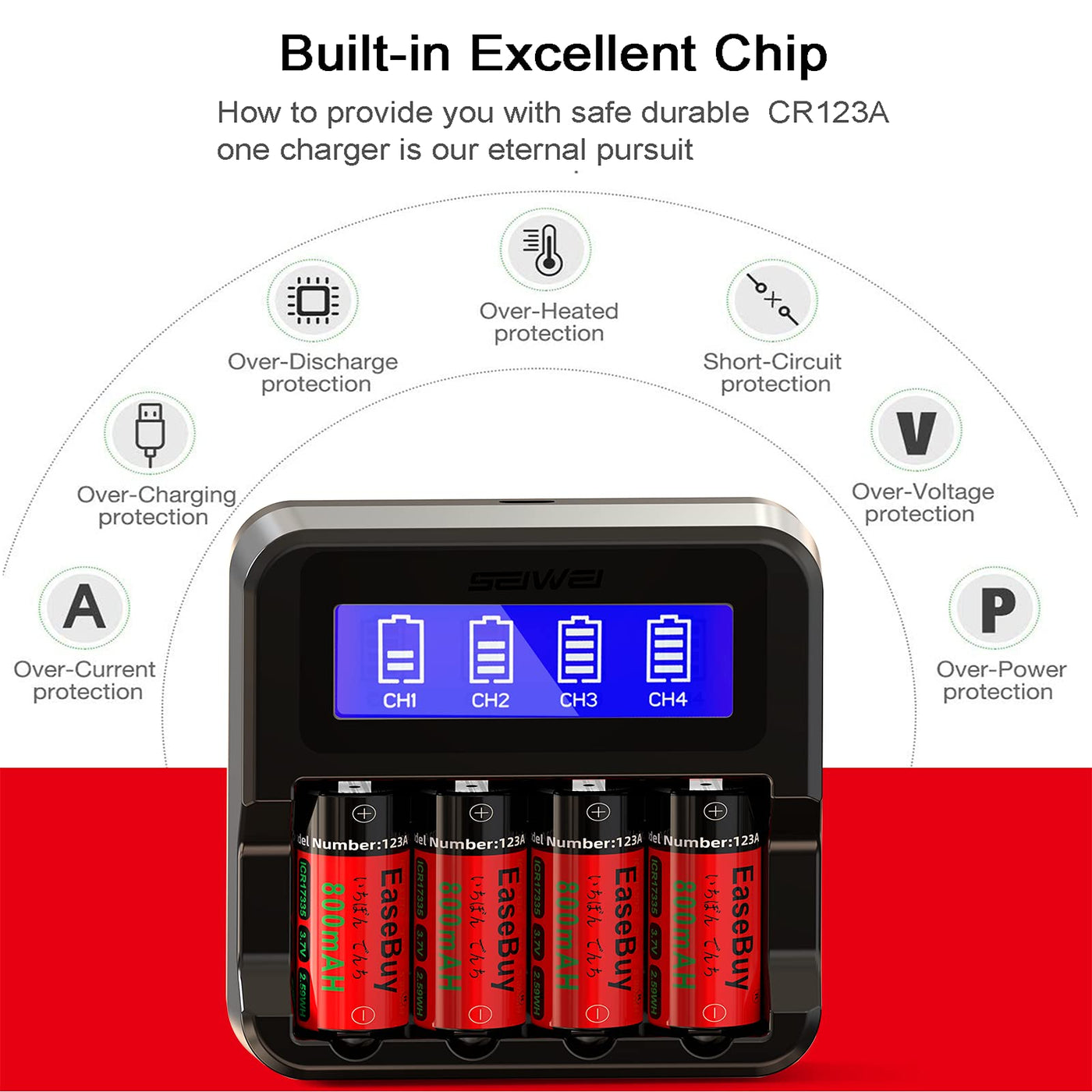 Q: Are there any safety features in the EaseBuy CR123A charger?A: Yes, the EaseBuy CR123A charger is equipped with several safety mechanisms, including fault and heat protection, short-circuit detection, and over-charge prevention to ensure safe and reliable charging.