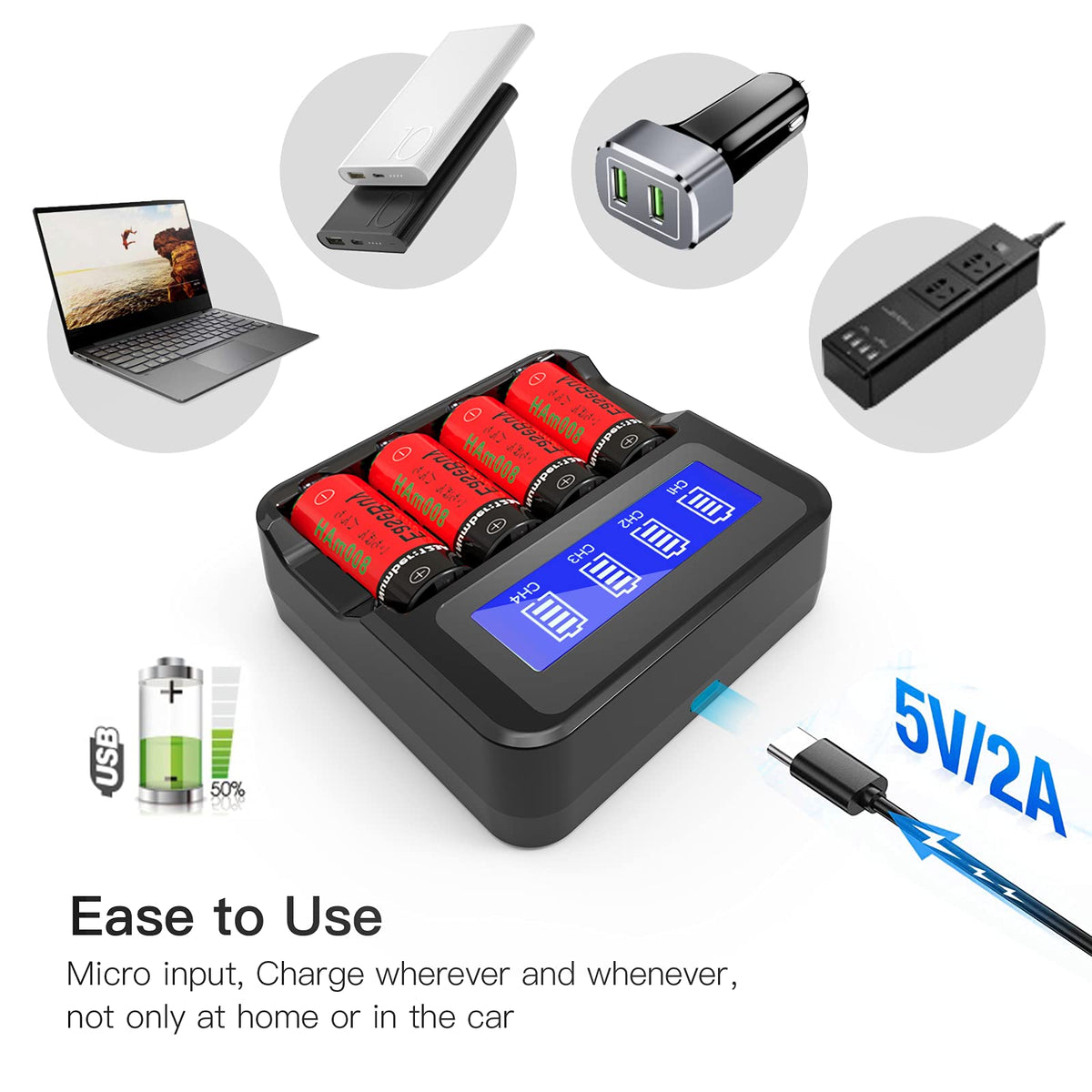 * Long-Lasting Performance Retain Up To 70% Of Original Capacity After 600 Full Charge And Discharge Cycles, Equivalent 250Pcs 3V 1500Mah Cr123A Batteries. * Easebuy Icr17335 Nimh Rechargeable Battery: Replace Non-Rechargeable Arlo Batteries. Battery Size: Icr17335(123A Size) Battery Type: 3.7V Arlo 123A Rechargeable Batteries, Ul And Un Certified Capacity:800Mah Dimensions: 17Mm (Diameter) X 33.5Mm (Length) * Arlo Cr123A Batteries Charger High Performance - Charge 4 Batteries Simultaneously, Each Of The Four Batteries Monitors And Charges Independently.Lcd Display To Show You The Charging Status. The Charger Used An Included, Usb, Charging Cable But Do Note That A Wall Adapter Is Not Included. Versatile Charging Option: Micro Input, Charge Wherever And Whenever, Not Only At Home Or In The Car. Note:Please Do Not Use This Charger To Charge 3V Cr123A Batteries. * What'S In The Box: 12 X Easebuy 800Mah Rechargeable 123A Batteries 1 X 4-Port Lcd Battery Chagrer 1 X Usb Charger Cable 1 X User Manual