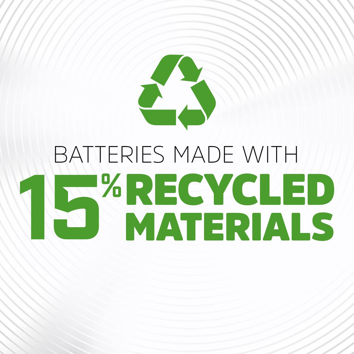 Q: Are Energizer Power Plus Rechargeable AA Batteries environmentally friendly?A: Yes, these batteries are made with 15% recycled materials and help reduce waste by being rechargeable, which saves money and resources over time.