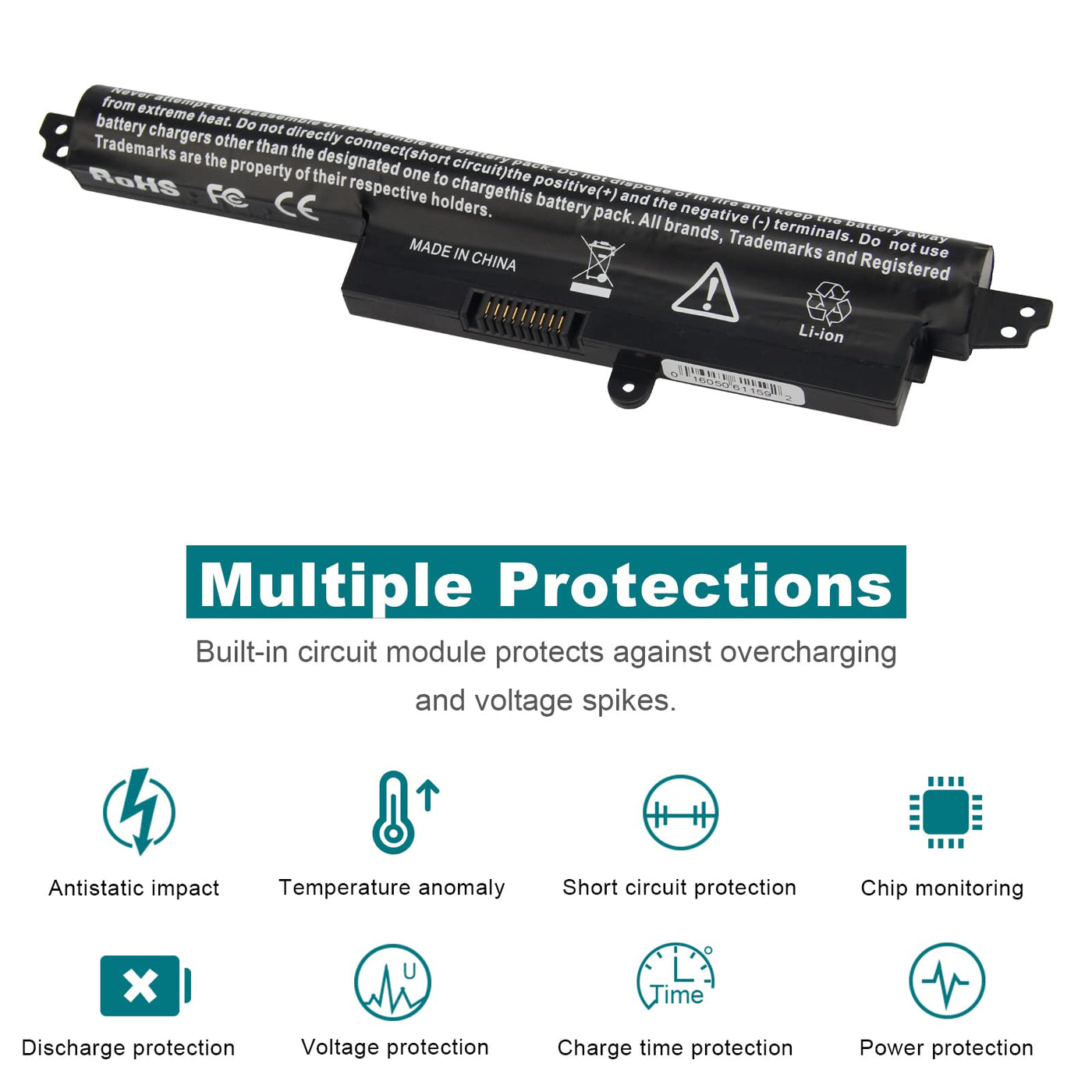 Q: What safety features does the Asus Vivobook X200CA battery include?A: The battery includes several safety features such as overcurrent protection, anti-overcharge, anti-overdischarge, and temperature control functions. These features help ensure safe operation and longevity.