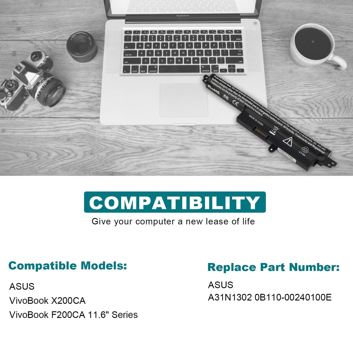 Q: What laptops are compatible with the Asus Vivobook X200CA battery?A: The Asus Vivobook X200CA battery is compatible with several models including X200CA, F200CA, X200M, and X200MA. It's essential to check your laptop's part number against the battery specifications to ensure compatibility.