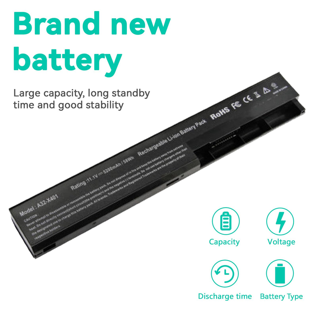 Compatible With Laptop Model / Original Battery Part Number: Asus F301 / F301A / F301A1 / F301U / F401 / F401A / F401A1 / F401U / F501 / F501A / F501A1 / F501U / S301 / S301A / S301A1 / S301U / S401 / S401A / S401A1 / S401U / S501 / S501A / S501A1 / S501U / X301 / X301A / X301A1 / X301U / X401 / X401A / X401A1 / X401U / X501 / X501A / X501A1 / X501U / X301Kb815A / X301Ki235A / X401Eb82A / X401Ec60U / X401Ee45U / X401Ei235A / X501Xb815A / X501Xb82A / X501Xc60U / X501Xe45U / X501Xi235A / A31-X401 / A32-X401 / A41-X401 / A42-X401 Specification: Battery Type: Li-Ion Voltage: 11.1V (Compatible With 10.8V) Capacity: 5200Mah / 4400Mah Cell: 6 Cells Recharge Cycles: 500 Operation Time: 1.5-2.5 Hours Buy With Confidence! 12 Months Warranty 24 X 7 E-Mail Customer Service Support! Taking Good Care Of Your Battery Having A Battery Fully Charged And The Laptop Plugged In Is Not Harmful. We Suggest That You Remove The Battery When The Hardware Gets Too Hot. Partial Discharges To Capacity Levels Of 20~30% And Frequent Charges Are Recommended While A Full Discharge Followed By A Full Charge Is Not. To Store A Battery For Long Periods Of Time, Its Charge Capacity Should Be Around 40% And It Should Be Stored In A Place As Fresh And Dry As Possible.
