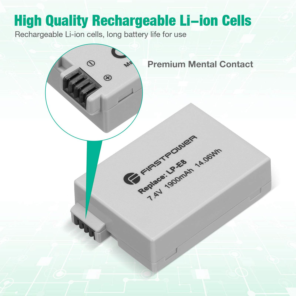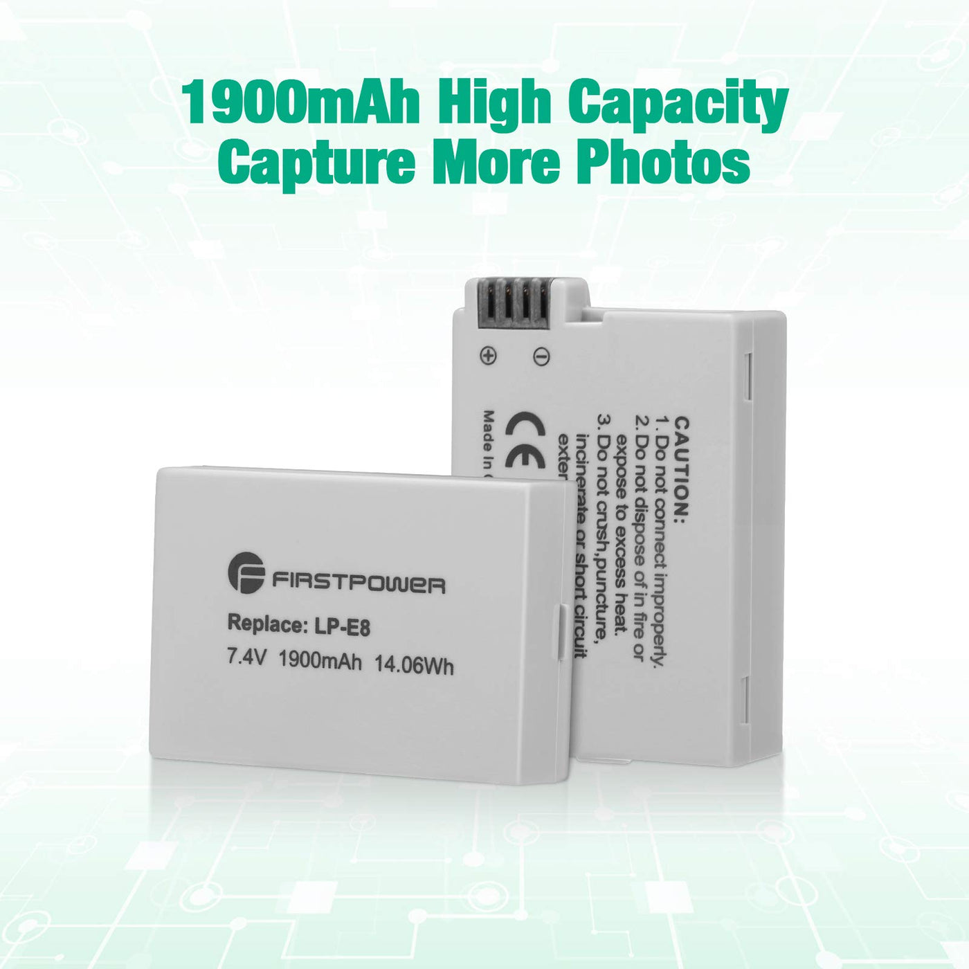 Q: What is the capacity and voltage of these batteries?A: The FirstPower LP-E8 batteries have a capacity of 1900mAh and a voltage of 7.4V, providing reliable power for your photography needs.