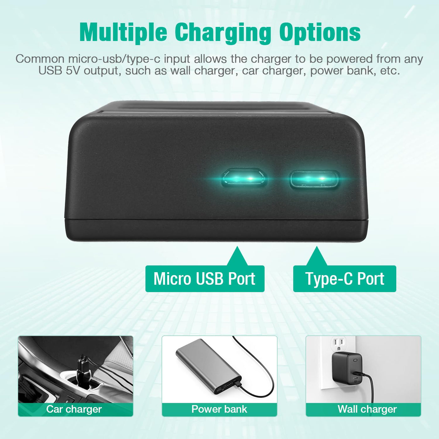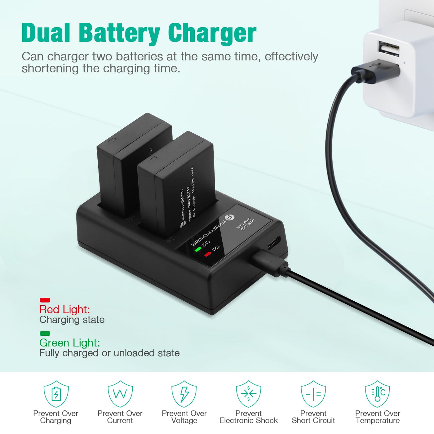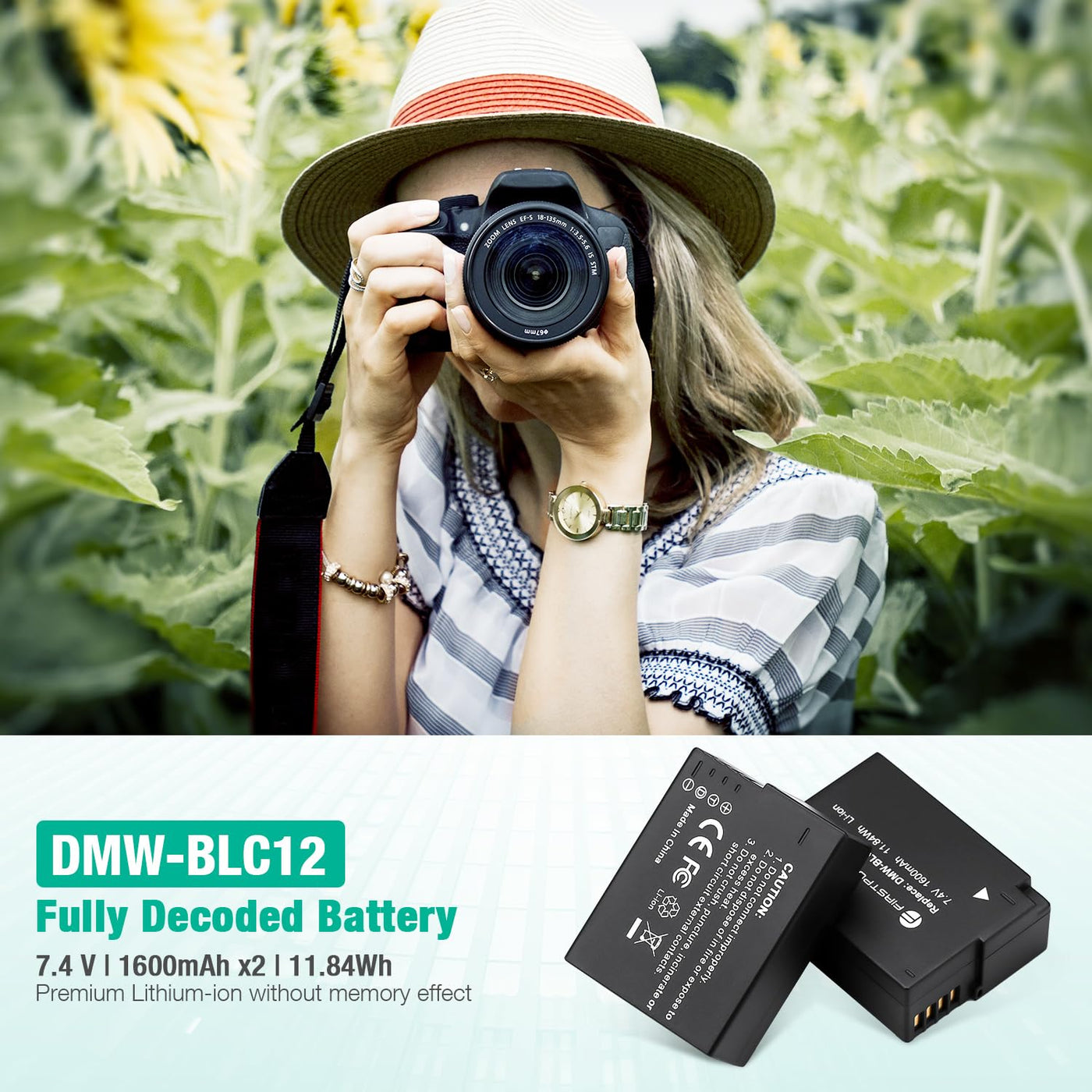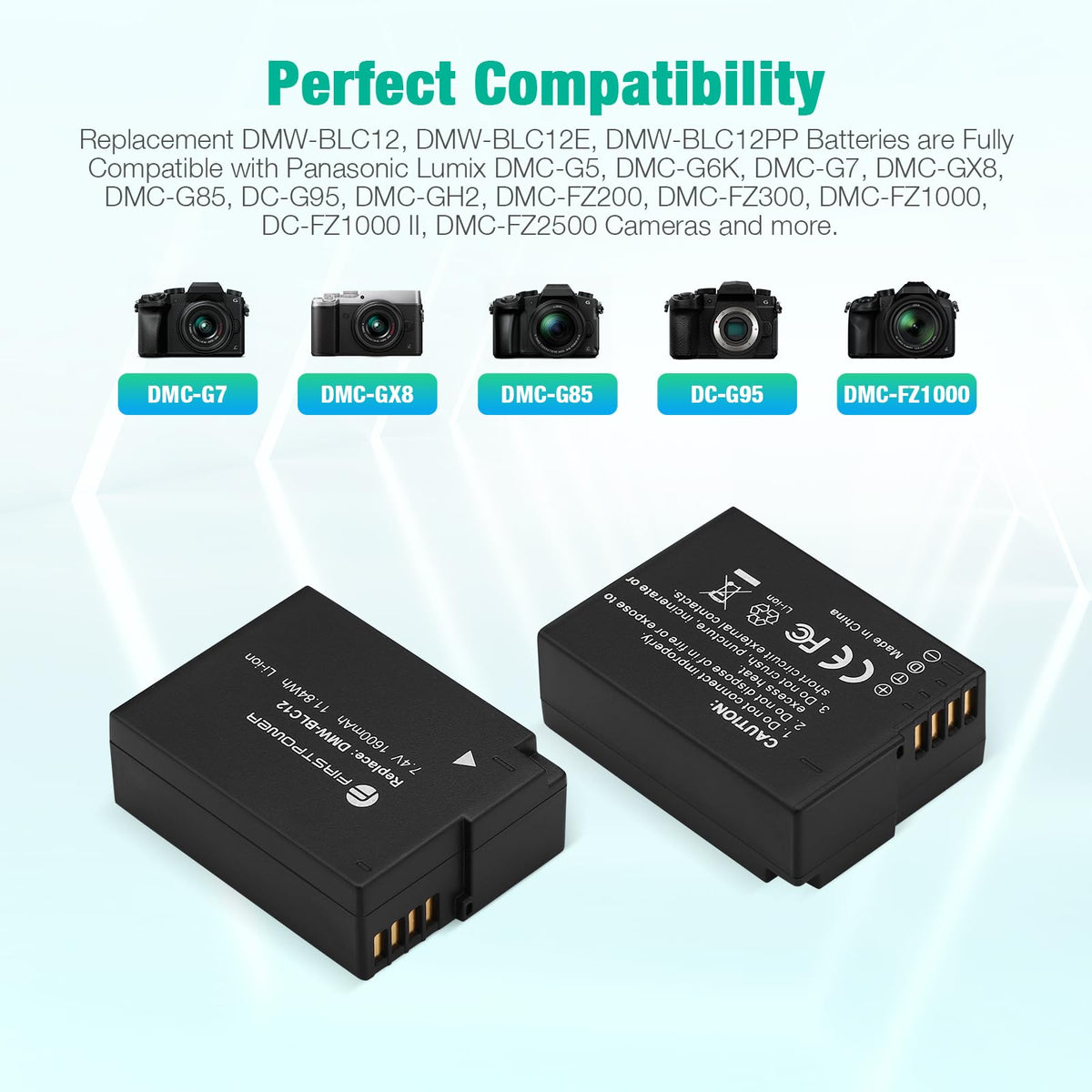 Replacement Dmw-Blc12, Dmw-Blc12E, Dmw-Blc12Pp Battery:Battery Type: Li-Ionbattery Voltage: 7.4Vbattery Capacity: 1500Mahdual Usb Charger With Micro Usb &Type-C Ports:Charger Model: Ds-Blc12Charger Input: 5V 2Acharger Output: 8.4V 700Ma*1/500Ma*2Compatible With The Following Models:Panasonic Dmc-Fz200 Panasonic Dmc-Fz300 Panasonic Dmc-Fz1000 Panasonic Dmc-Fz2500 Panasonic Dmc-G5 Panasonic Dmc-G6 Panasonic Dmc-G7 Panasonic Dmc-Gx8 Panasonic Dmc-G85 Panasonic Dmc-Gh2Package List:2 X Replacement Panasonic Dmw-Blc12 Battery1 X Smart Led Display Dual Charger1 X Charging Cable (Without Ac Adapter)1 X Microfiber Cleaning Cloth
