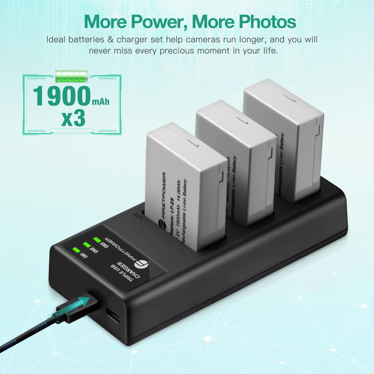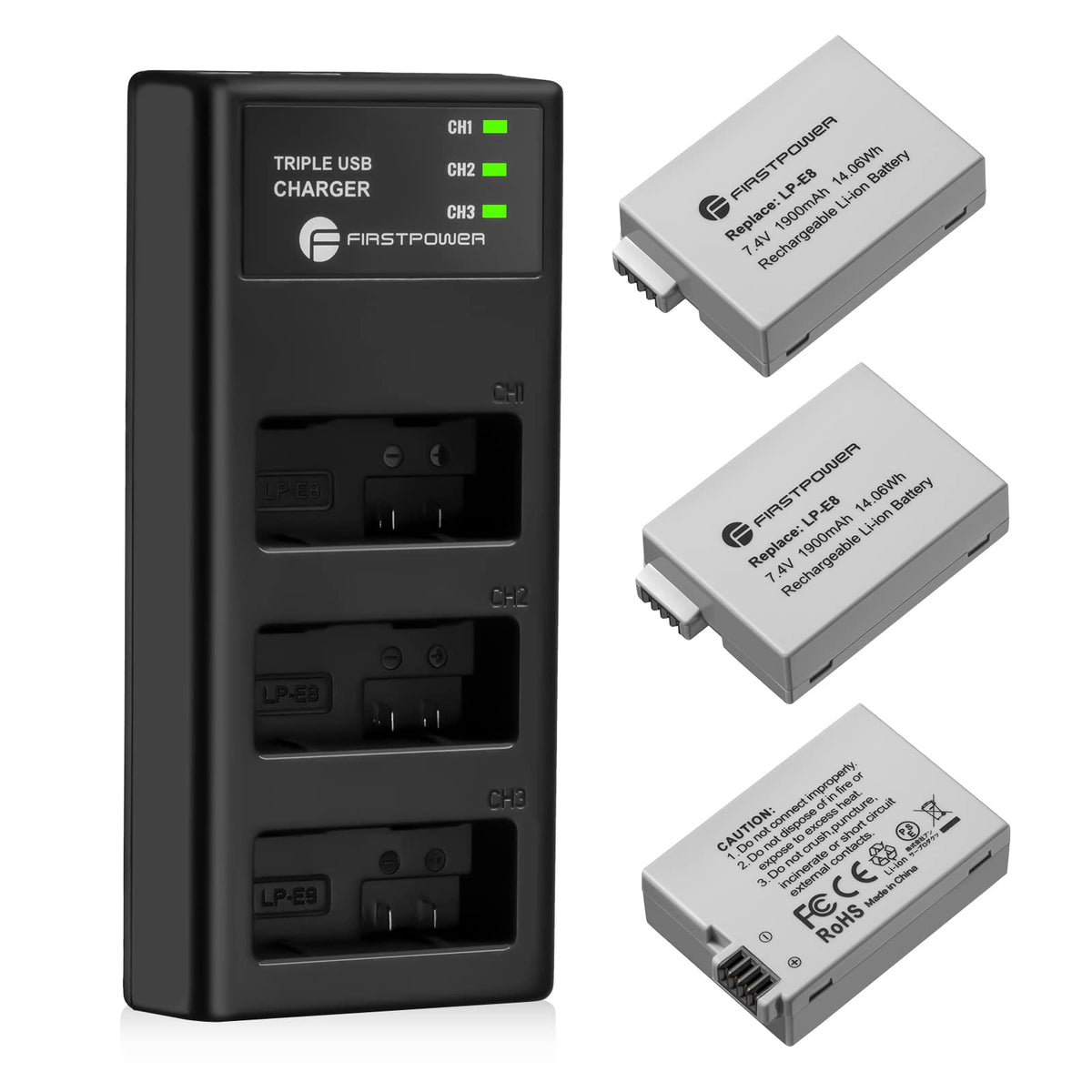 Firstpower Lp-E8 Battery 3-Pack And Triple Slot Charger For Canon Eos Rebel T2I, T3I, T4I, T5I, 550D, 600D, 650D, 700D, Kiss X4, Kiss X5, Kiss X6 Digital Cameras