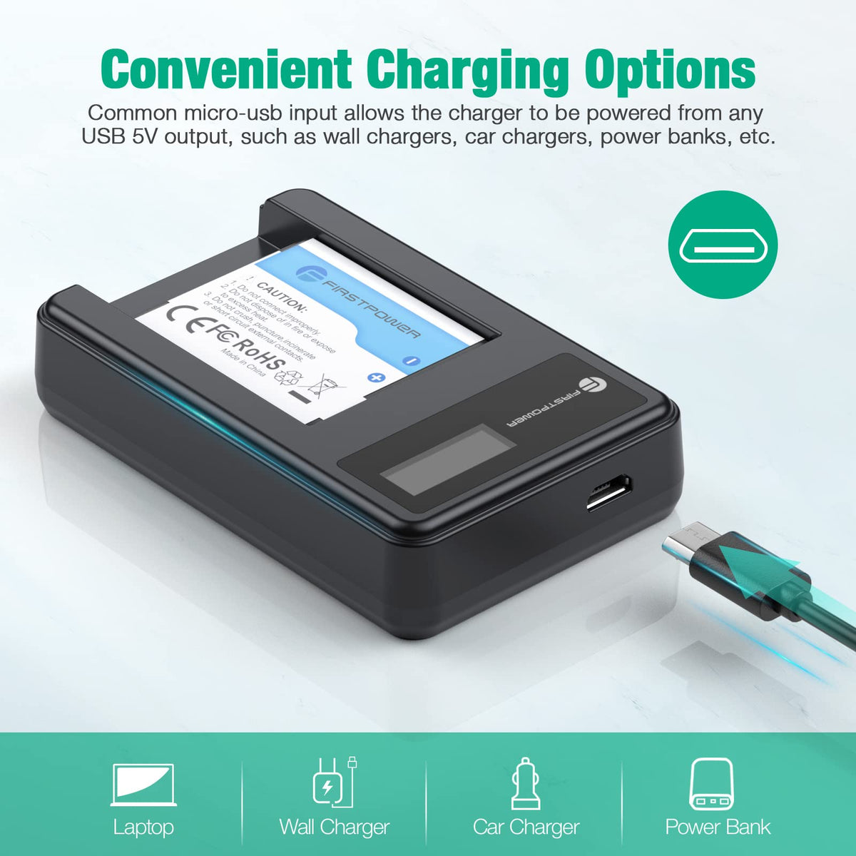 Q: Can I charge the FirstPower NB-11L battery using a USB device?A: Absolutely! The charger comes with a convenient USB-C cable, allowing you to charge the batteries using any USB power source, such as a laptop, wall charger, car adapter, or power bank, making it versatile for on-the-go charging.