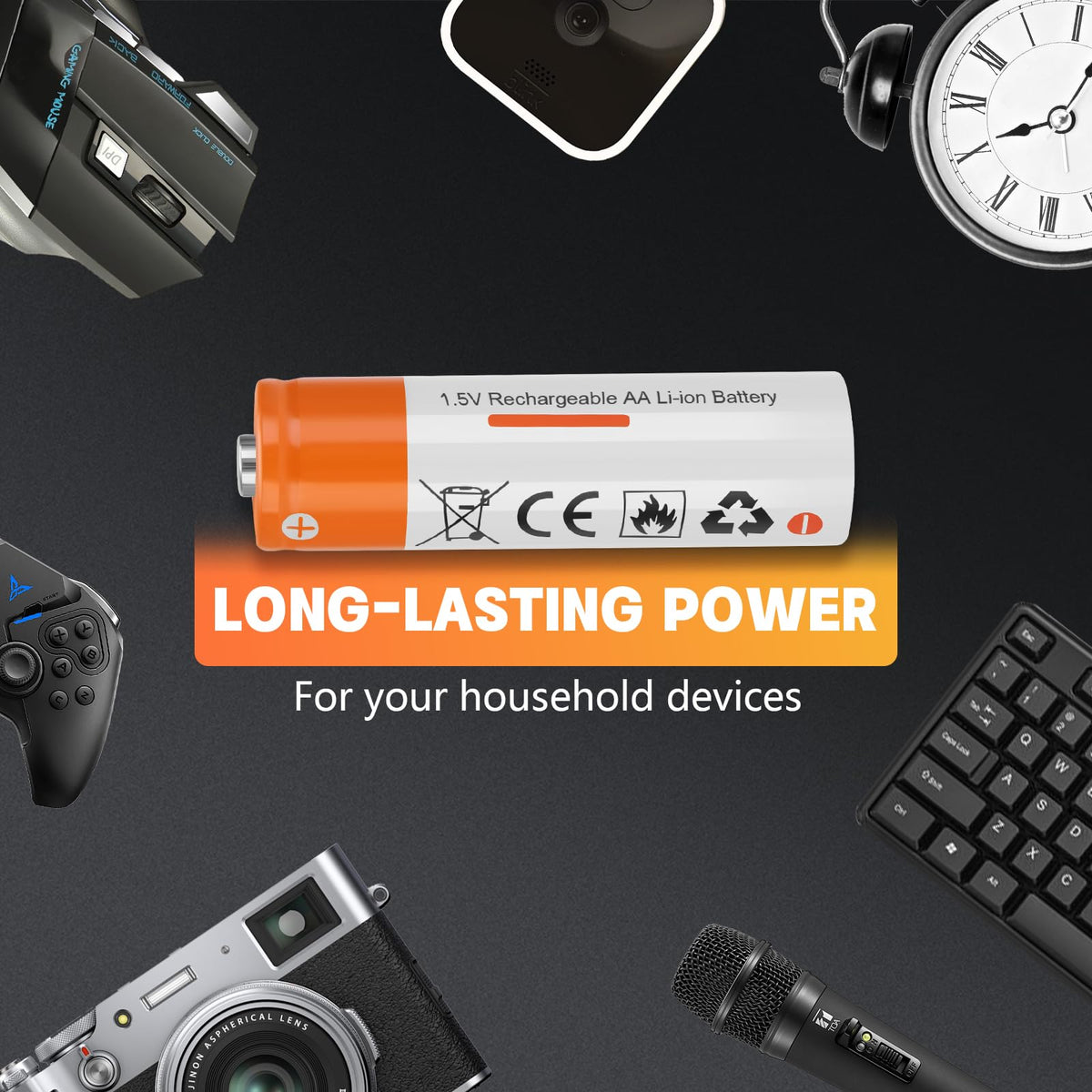 Specification: Battery Type:Lithium Ion Aa Battery Output Voltage: 1.5V Battery Capacity: 2600Mwh Battery Full Charge Time: Approximately 2 Hours Battery Life: 1000+ Times Recycling Use Charger Compatity: Li-Ion Aa/Aaa Battery Charger Type:4 Bay/Usb Input Charging/Independent Solt Package Includes: 12 X Aa Rechargeable Batteries 1 X 4-Bay Usb Charger