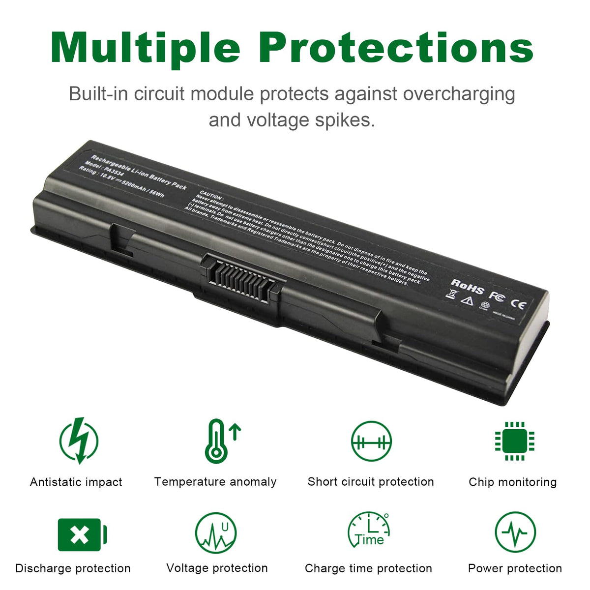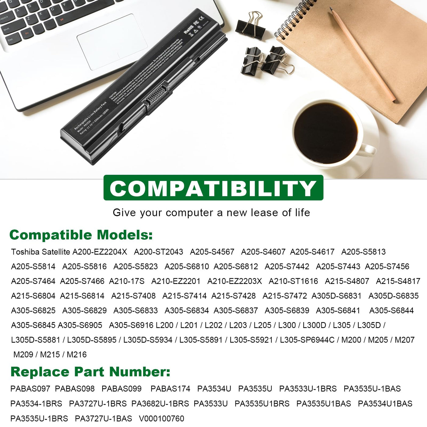 Q: What laptops are compatible with the Futurebatt Laptop Battery PA3534U-1BRS?A: The Futurebatt Laptop Battery PA3534U-1BRS is compatible with several Toshiba Satellite models, including the A200, A205, A210, A215, A300, A305, L200, and many others. Always check the part numbers listed in the description to ensure compatibility with your specific model.
