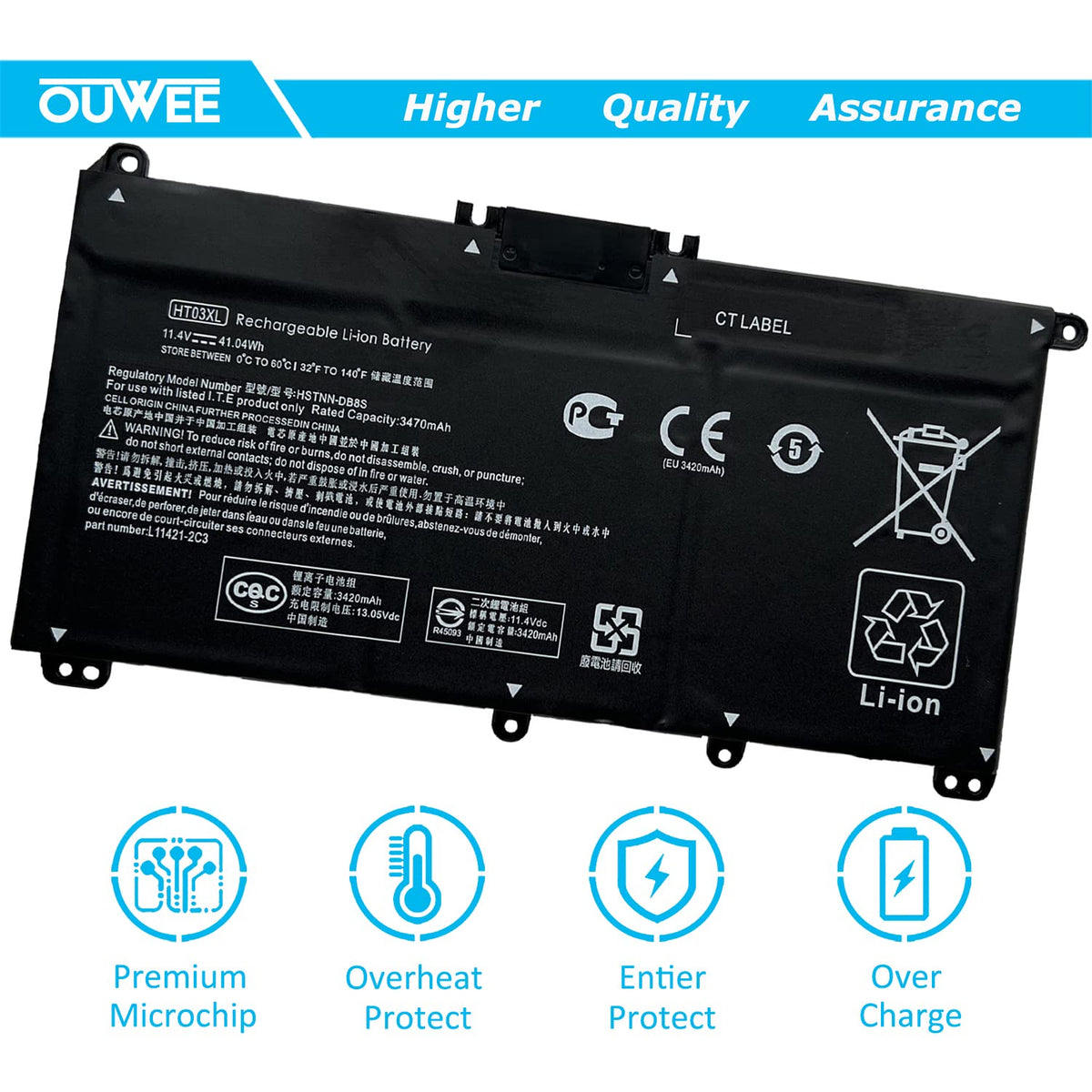 Welcome To Ouwee Before Placing Your Order, We Highly Suggest You To Open The Back Case Of Your Latptop And Check Out The Exact Part Number Of Your Laptop'S Original Battery. 1.Battery Type: Rechargeable Li-Ion Battery 2.Model: Hstnn-Ub7J 3.Voltage: 11.55V 4.Capatity: 41Wh 3615Mah 5.Connector: Please Refer To The Picture And Check It. 6.Certificate: Ce,Rohs,Fcc,100% New From Manufacturer, Grade A Cell 7.Worry-Free Warranty: At Ouwee, We Believe In Our Battery. That'S Why We Back Them All With An 12-Month Warranty And Provide Friendly Customer Service, Easy-To-Reach Support. 8.Replacement For Part Number: Hstnn-Ub7J L11421-542 Ht03Xl Hstnn-Ib8O L11421-1C3 L11119-855 Hstnn-Lb8L Hstnn-Ib80 Hstnn-Ib8X Hstnn-Db8S Hstnn-Db8R Hstnn-Lb8M 9.Compatible Models (Use ''Ctrl+F To Find Your Model Quickly'') Fit For Hp Pavilion X360 14-Dh1153Ng 15-Dq0065Cl Series Fit For L11119-855 Hp Battery Pavilion 14-Ce 14-Cf 14-Ck 14-Cm 14-Df 14-Ma 14Q-Cs 14Q-Cy 14S-Cf 14S-Cr Series Fit For Hp Pavilion 15-Cs 15-Cw 15-Da 15-Db 15G-Dr 15T-Da 15T-Db 17-By 17-Ca Series Fit For Hp 240 G7, 245 G7, 250 G7, 255 G7, 340S G7, 470 G7, 340 G5, 348 G5 Series Not All Models Are Listed,Please Check The Part Number Of Your Original Battery. 10.Package Included: 1X Ht03Xl Battery. 11.For Optimal Use Battery: ?Discharge The New Battery To 5% (Not 0%), Then Charge And Cycle 3-4 Times To Wake Up The New Battery. ?The Important Point Is To Perform A Full Discharge Charge Every Other Month To Extend Battery Life. ?Don'T Connect Adapter For A Long Time While Using The Battery. It May Damage The Battery. ?Avoid Artificial Shocks, Disassembly, Crush Or Puncture. Do Not Dispose Of In Fire Or Water.