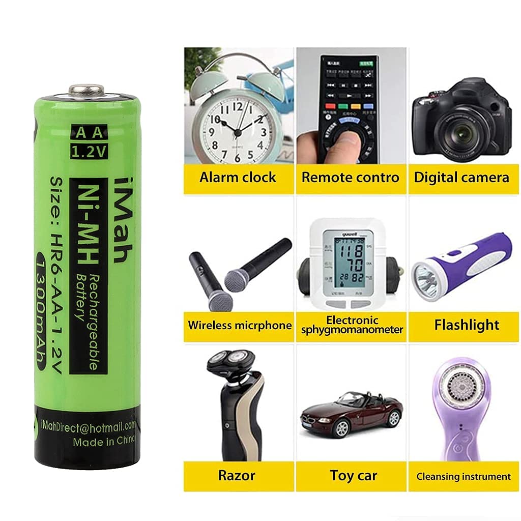 Imah Hr6 1.2V 1300Mah Ni-Mh Aa Rechargeable Batteries, Pack Of 10 High Capacity: 1300Mah (Milliamp-Hour) Real Rechargeable Capacity. Weights 22.3G/0.78Oz Per Aa Battery. Reusable, Cost-Effective, Low Self-Discharge And No Memory Effect With A Low Self-Discharge Technology, Your Batteries Can Sit For Years And Still Be Ready When You Need Power. For The Best Performance, Store Fully Charged Batteries At About 68F/20C. Maintain 75% Charge For Up To One Year And 45% Of Original Charge After Being Stored For 3 Years. Recharge Up To 1200 Times. Built For The Cold: When You Need Batteries That Perform Well Even In Cold Temperatures, These Batteries Maintain High Power In Low Temps. Compatible With Household Devices: Imah Hr6 1300Mah Aa Rechargeable Batteries Will Work On Household Devices Such As Digital Cameras, Remote Controls, Wireless Mouse, Hand Held Games, 2-Way Radios, Pdas, Led Flashlights, Alarm-Clocks, Lcd-Tvs, Toothbrushes, Shavers, Portable Audio Players, Solar Charger, Solar Lights, Toys And Other Devices That Use Aa Batteries.