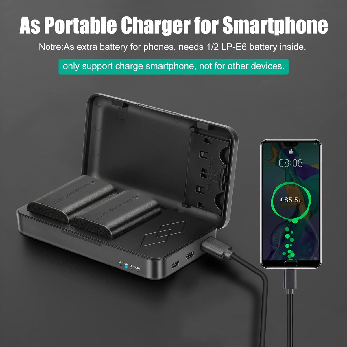 Jyjzpb Lp-E6N Replacement Battery (2 Pack) And Multi-Charger Case With Power Bank Function(Real 1800Mah Capacity Per Pack) Jyjzpb Aims To Build High-Quality Camera Batteries And Chargers, Every Battery Has Real Capacity, Give Our Buyer The Best Experience. Power Bank Function: &Nbsp;The Charger Case Has A 10W Usb Port That Supplies Power To A Usb Device. Eliminate The Trouble Of Running Out Of Electricity. &Nbsp;Note: This Function Requires An Lp-E6 Battery As A Power Source. Camera Case Is Suitable For Carrying Out: Multi-Charger Case Size Is 5.1*2.8*1.0In/L*W*H. It Can Use Jyjzpb Multi-Charger Case To Charge 2 Lp-E6 Batteries, As A Power Bank Charge To The Device, Or As A Storage Case To Store 2 Batteries And 2 Sd Cards. Product Specification: Battery Type: Lithium-Ion Battery Capacity: 1800Mah(Real Capacity), 7.4Wh Input: Micro Usb / Type C 5V 2.1A Output Power: 8.4V==1000Ma *1 ; 8.4V==500Ma *2 Usb Power: 5V==2100Ma (About 1 Hour To Fully Charge Iphone X) Size Of Charger Case: 5.1*2.8*1.0In/L*W*H Fit For Canon Model: Canon Eos 5D Mark Ii, 5D Mark Iii, 5Ds, 5Ds R, 6D, 6D Mark Ii, 7D, 7D Mark Ii, 60D, 60Da, 70D, 80D, Eos R, Xc10, Xc15. Indicator Light Status: 2 Batteries Charging -≫ Ch1, Ch2 Is Red 2 Batteries Charged -≫ Ch1, Ch2 Is Green Usb Running -≫ Dch1/Dch2 Is Blue Package Includes: 2 * 1800Mah Replacement Battery For Canon Lp-E6 1 * Multi Battery Charger Case 1 * Micro Usb Cable Note: 1. When You Need To Use The Charger Case To Place The Sd Card, You Try Your Thumbnail, Press The Middle Gap, And Lift Up; 2. Our Charger Box Is Fully Charged With 1 Battery About 2 Hours, 2 Batteries About 4 Hours.