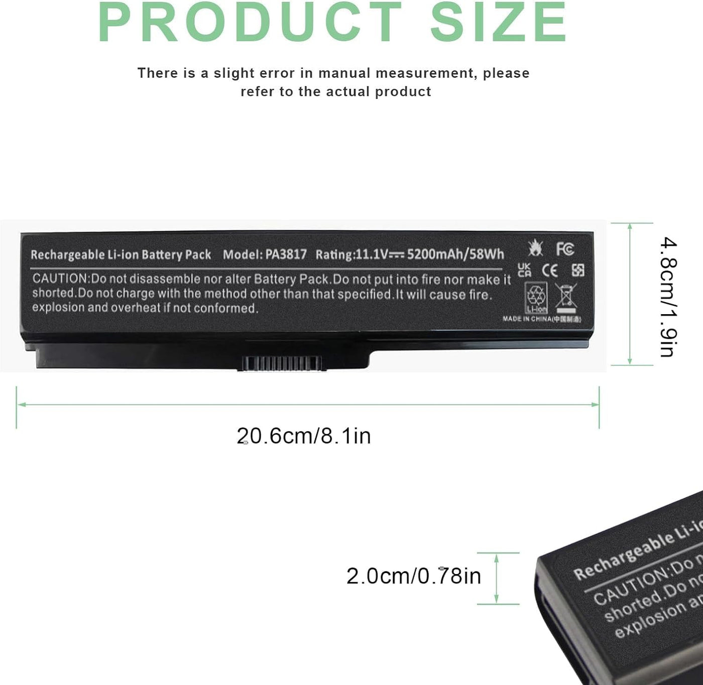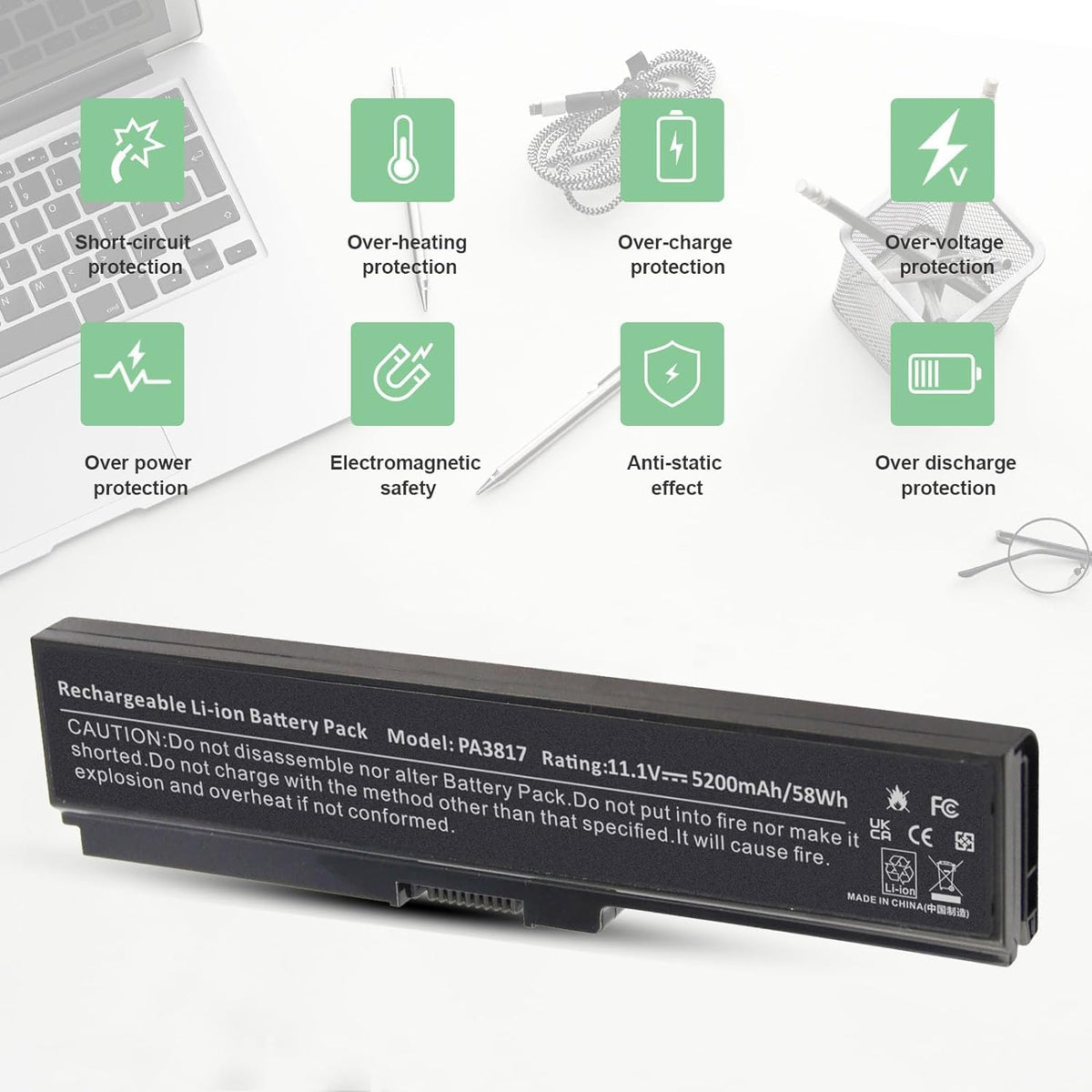 Q: Is the Toshiba PA3817U battery safe to use?A: Yes, the Toshiba PA3817U battery is CE, RoHS, and FCC certified, ensuring compliance with safety standards. It features built-in circuit protection for enhanced safety and stability.