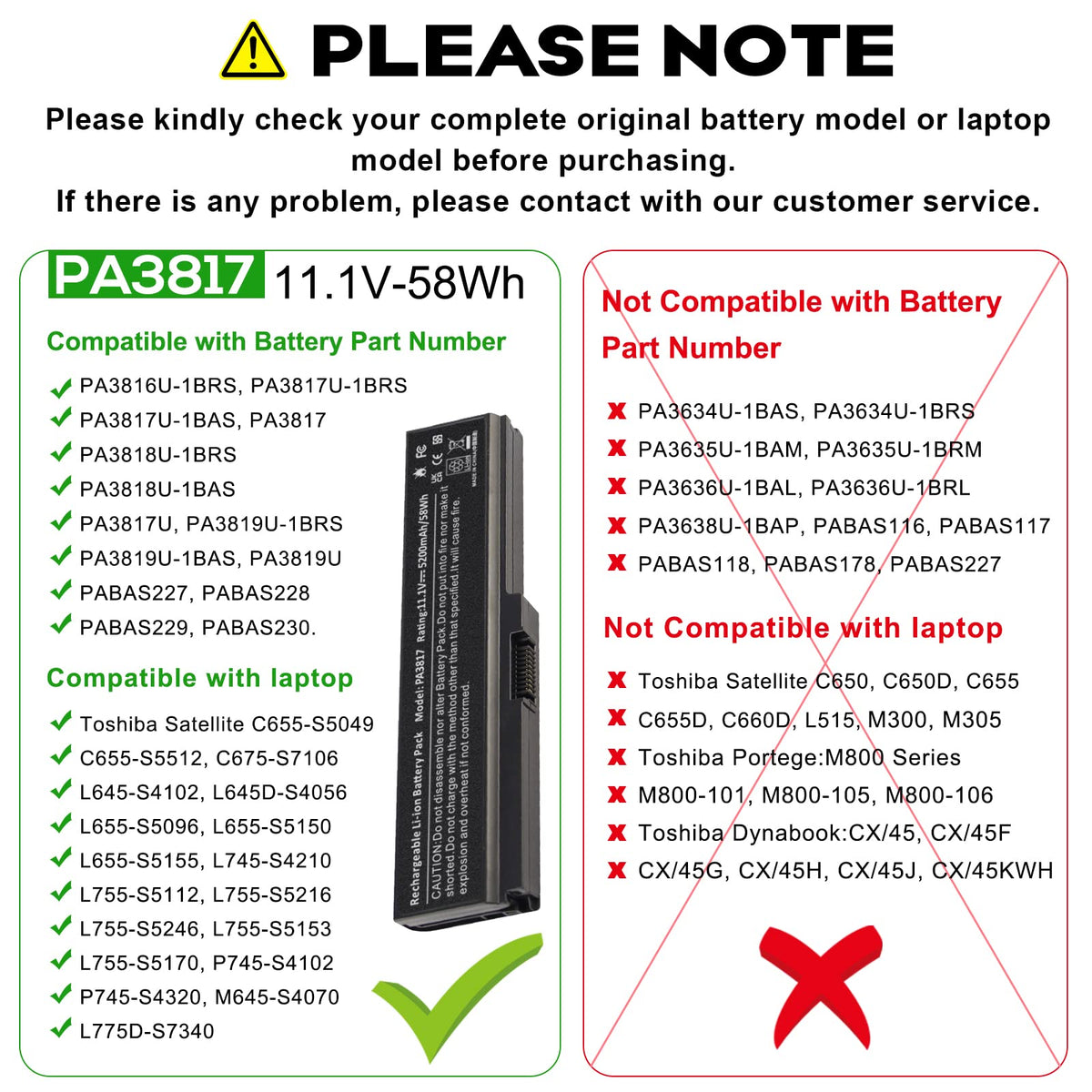 Q: What laptop models are compatible with the Toshiba PA3817U battery?A: The Toshiba PA3817U battery is compatible with several models including Satellite C655, C675, C675D, L645, L645D, L655, L675, L745, L755, A660, and many more. Please refer to the product description for a comprehensive list of compatible models.