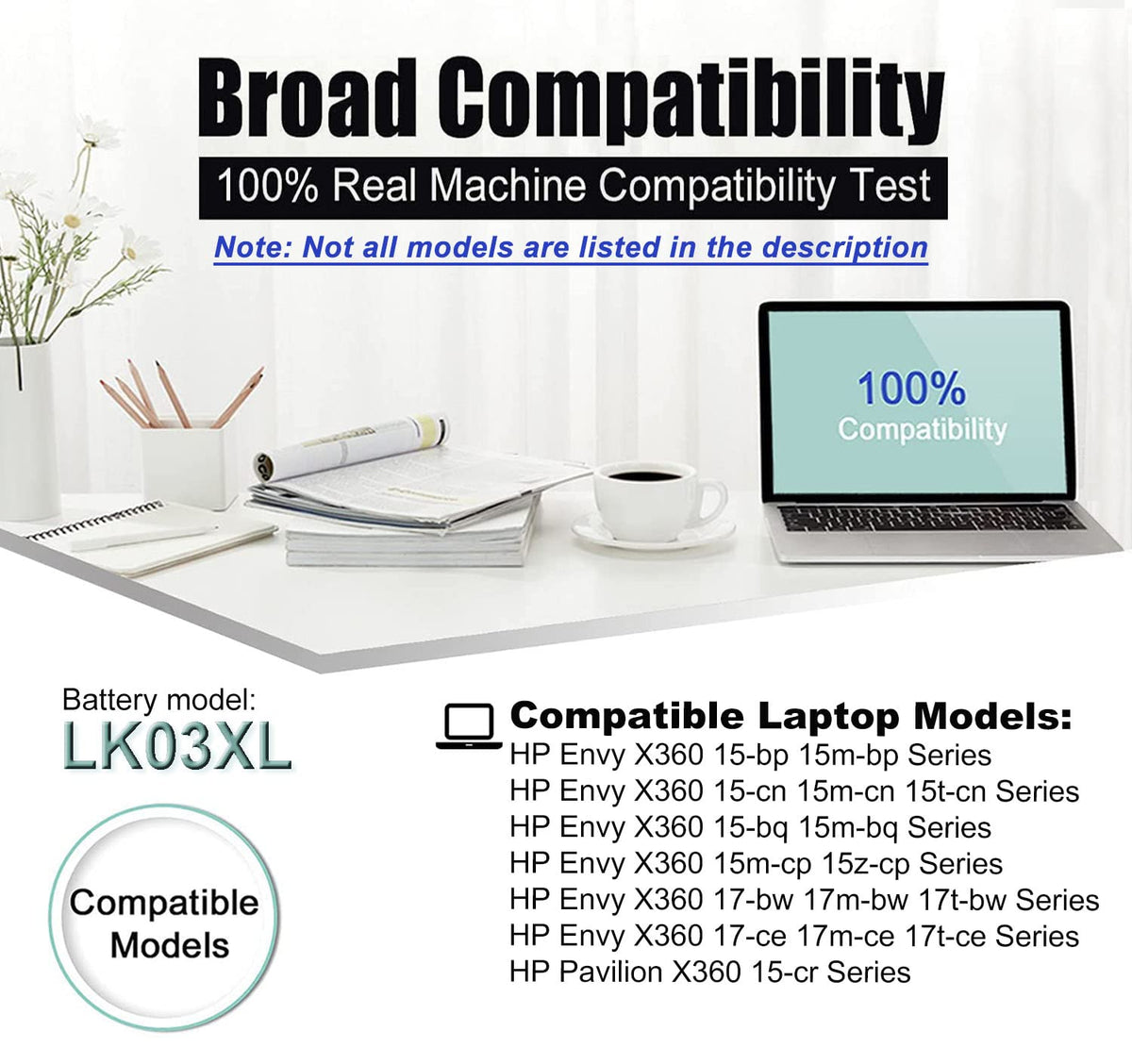 Q: What laptop models are compatible with the LK03XL battery?A: The LK03XL battery is compatible with various HP Envy X360 models, including the 15-BP000 series, 15m-bp000, and 17m-ae0xx series, among others. It fits models like 15-BP001TX, 15-BP002TX, and 15m-bq1xx series. For the most accurate fit, please check the part number of your original battery.