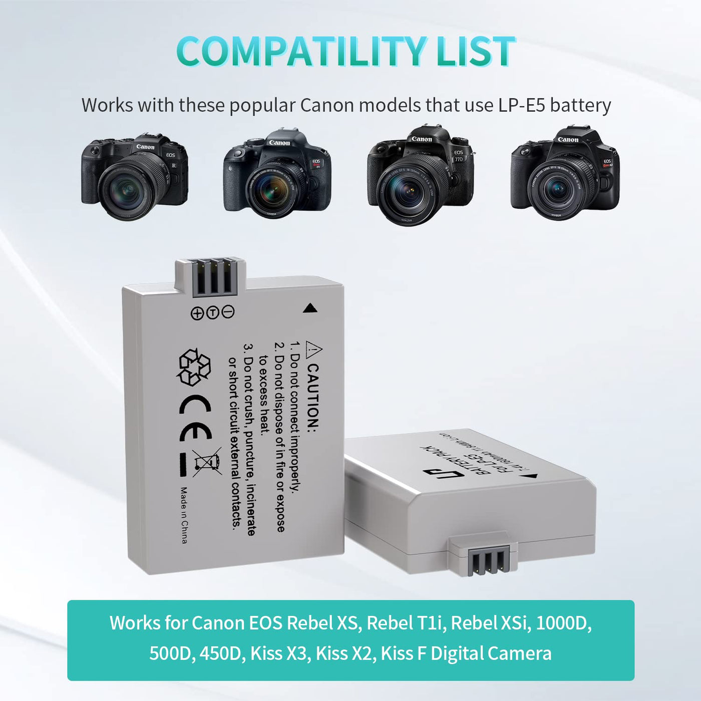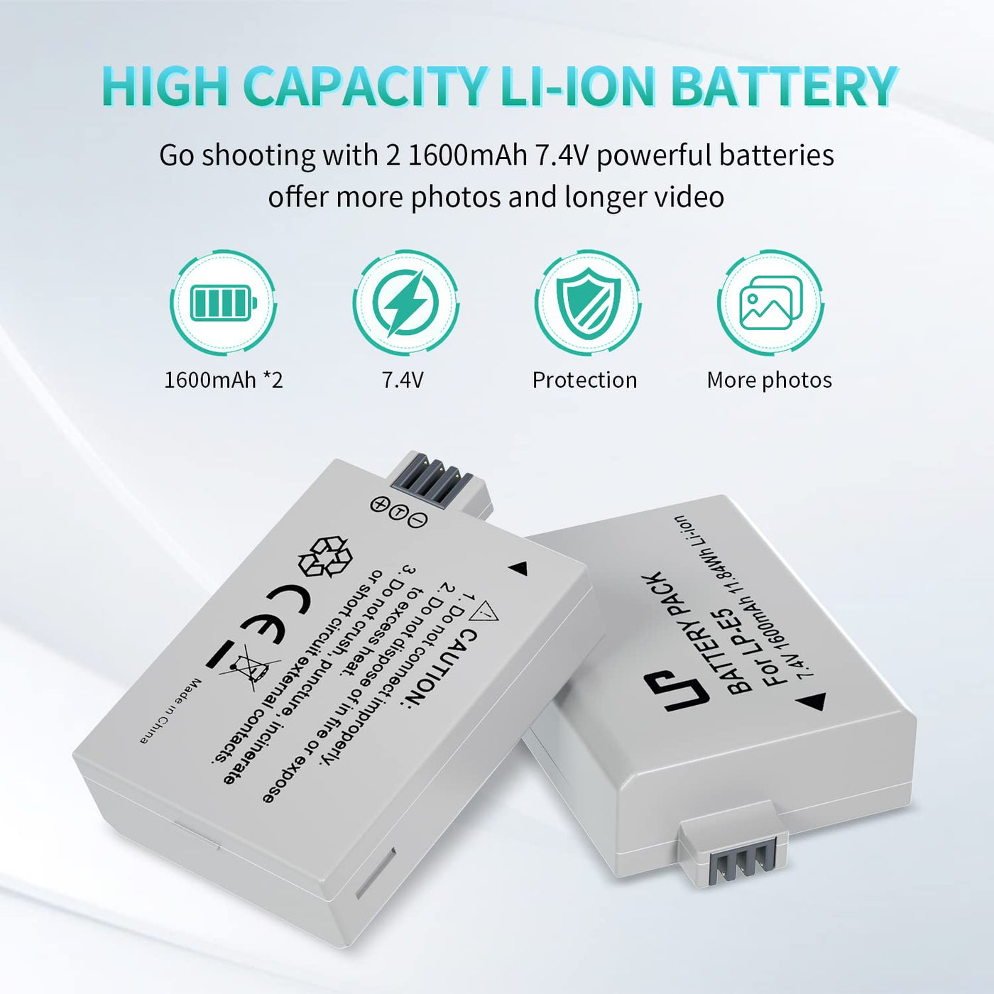 Bring Your Digital Camera Back To Life With A New Battery.Enduring For Shooting Your Every Wonderful Moment.Lp 2-Pack Replacement Battery, Compatible With Eos Rebel Xs, Rebel T1I, Rebel Xsi,1000D, 500D, 450D, Kiss X3, Kiss X2, Kiss F Digital Camera. Battery: Volt: 7.4V Capacity: 1600Mah Composition: Lithium-Ion Caution:Do Not Connect Improperly. Do Not Dispose Of In Fire Or Expose To Excess Heat. Do Not Crush, Puncture, Incinerate Or Shot Circuit External Contacts.