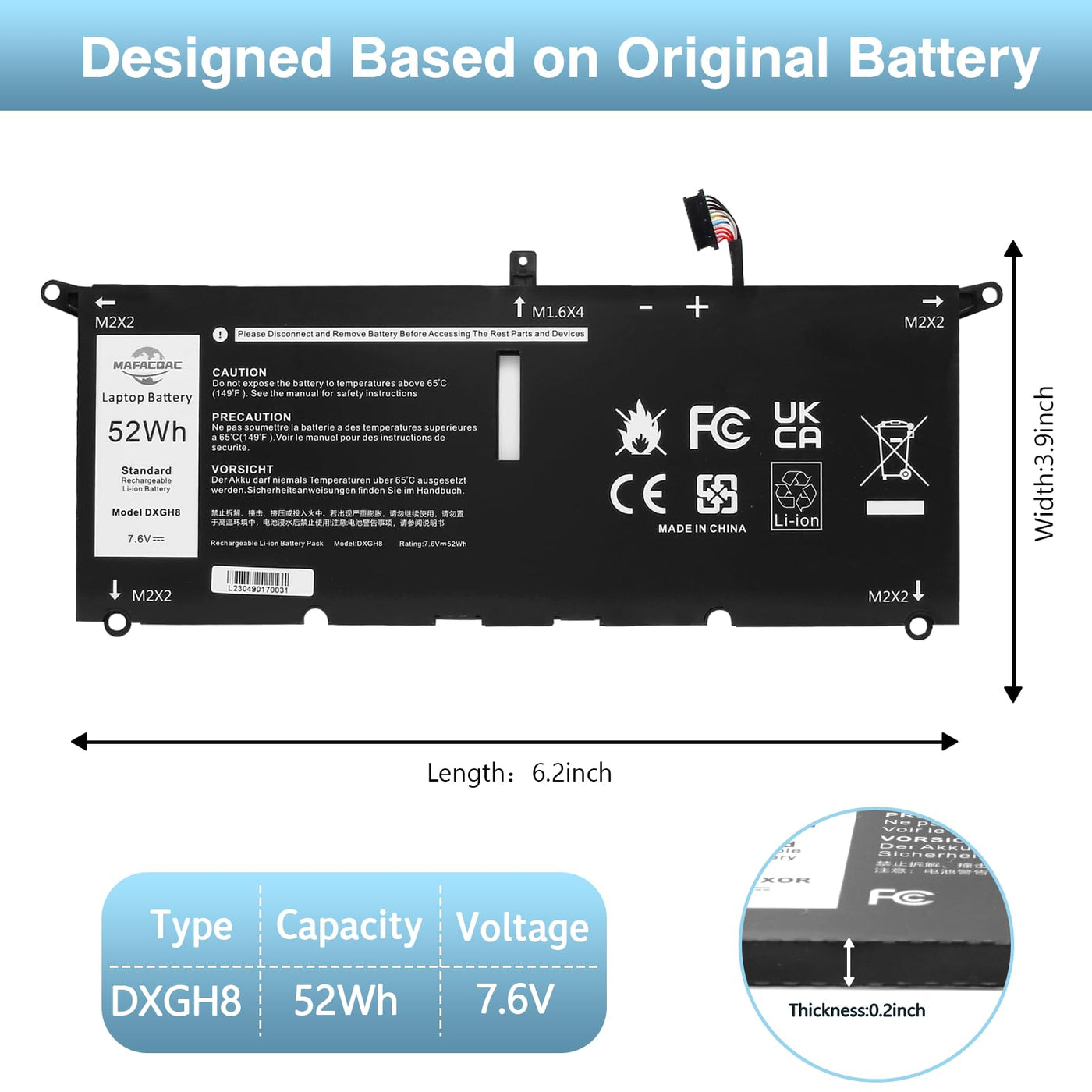 Mafacbac Type Dxgh8 Battery Replacement For Dell Xps 13 9370 9380 9305 Inspiron 13 7000 7391 2N1 5390 5391 Laptop Battery Specifications: 100% New And High Quality Cells Name: Dxgh8 Battery Voltage: 7.6V Capacity: 6800Mah / 52 Wh Battery Type: Lithium-Ion Condition: New Replacement Press [Ctrl + F] To Search Your Laptop Model/Part Number. Compatible With Dell Original Laptop Models: For Dell Xps 13 9370 Series For Dell Xps 13-9370 Xps13-9370 13-9370-D1605G 13-9370-D1605S 13-9370-D1705G 13-9370-D1705S 13-9370-D1805G 13-9370-D1809G 13-9370-D1905Tg 13-9370-D2905G For Dell Xps 13 9380 2019 Series For Dell Xps 7390 Series For Dell Xps 13 7390 Series For Dell Xps 13 9305 Series For Dell Inspiron 7391 Series For Dell Inspiron 7391 2-In-1 Series For Dell Inspiron 13 7391 Series For Dell Inspiron 13 7000 7391 2-In-1 Notebook For Dell Inspiron 13 5390 5391 Series For Dell Latitude 3301 E3301 Series For Dell Vostro 5390 Series For Dell Vostro 5391 Series And More Compatible With Part Numbers: Dxgh8 G8Vcf 0H754V H754V 0V48Rm V48Rm Hk6N5 P113G001 P114G001 P115G001 P82G P82G001 P82G002