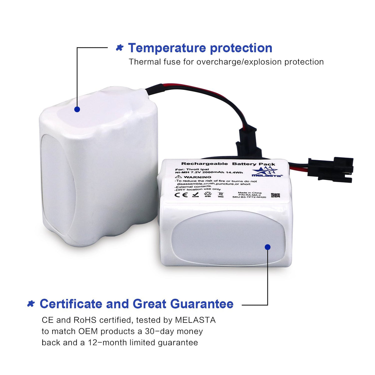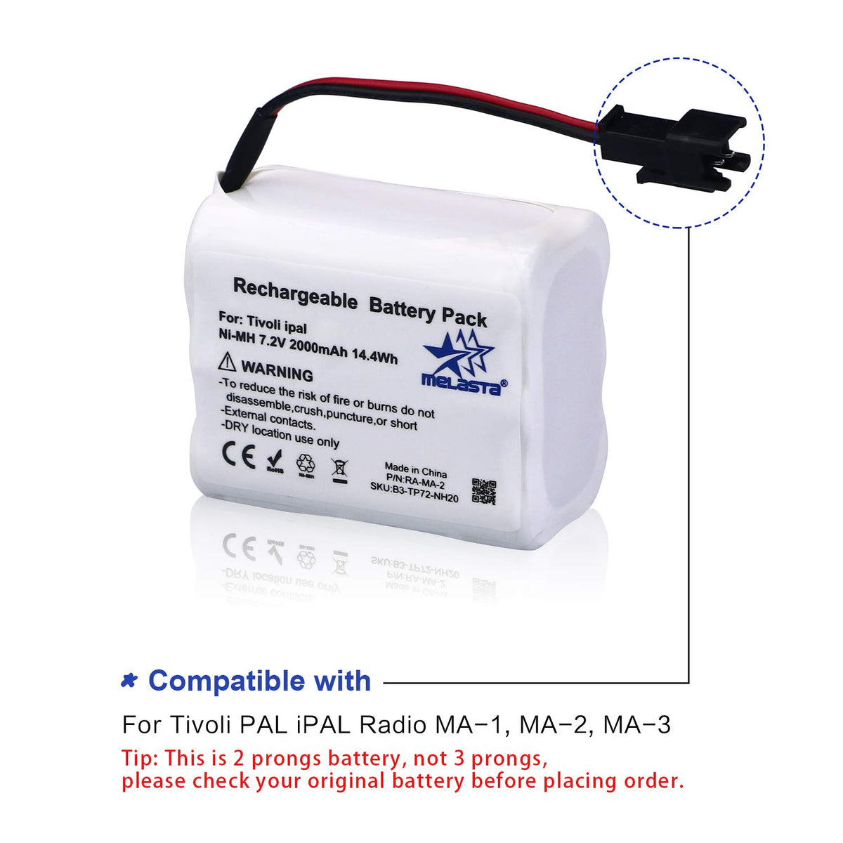 Advantage: Melasta 7.2V Nimh Batteries Are Made Of The Finest Cells And Parts, They Are Designed To Meet Or Exceed The Original Equipment Specifications For Your Tivoli Pal/Ipal Radio (Ma-1, Ma-2, Ma-3). Real Capacity 2000Mah Support Longer Runing Time. Specification: Battery Capacity: 2000Mah Battery Voltage: 7.2V Battery Type: Ni-Mh Color: White Dimension: 50*43*29Mm/1.97*1.69*1.14In Weight: 180G / 6.34Oz. Compatible Models: Tivoli Pal Ipal Radio Replacement Battery Model: Ma-1, Ma-2, Ma-3 What In Box: 1 X 7.2V 2000Mah Nimh Battery Please Check If Your Radio Uses A 2 Or 3 Wire Battery Before Ordering! (This Is A 2 Wire Battery)