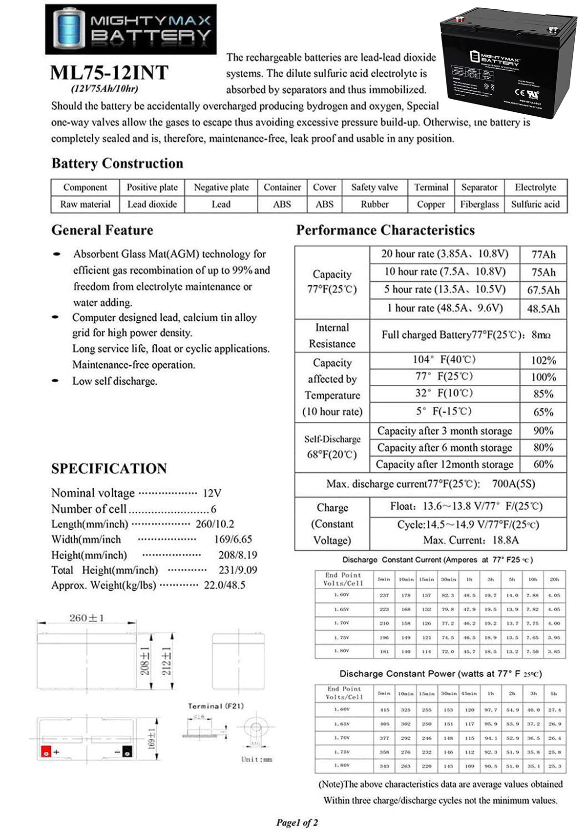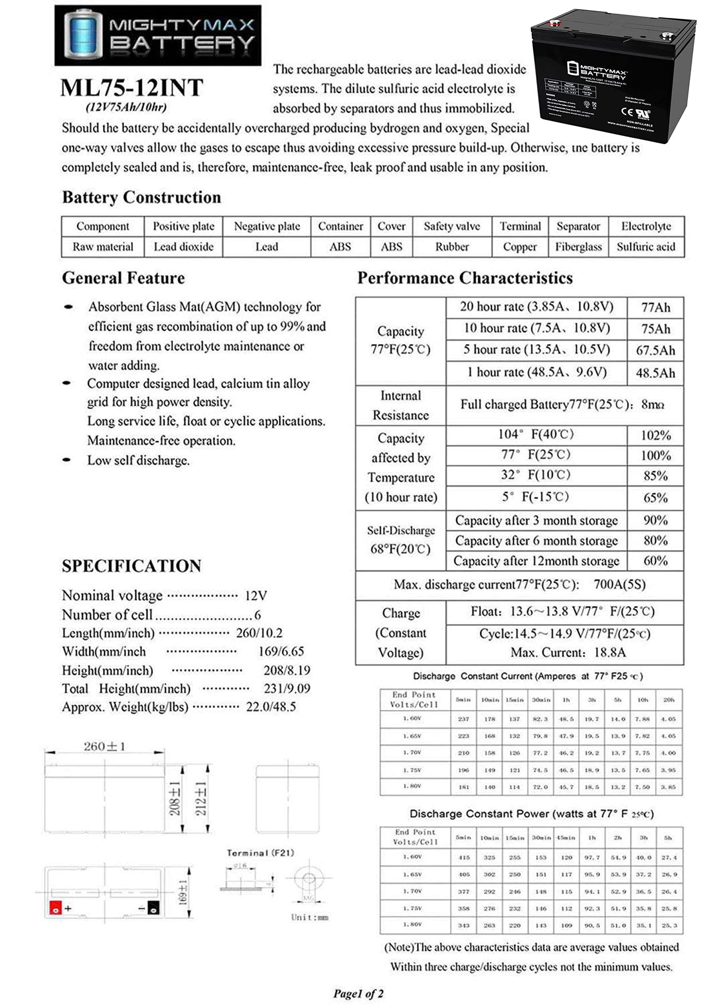 Mighty Max Battery 12V 75Ah Internal Thread Replacement Battery Compatible With The Basement Watchdog Model Bw-27Agm