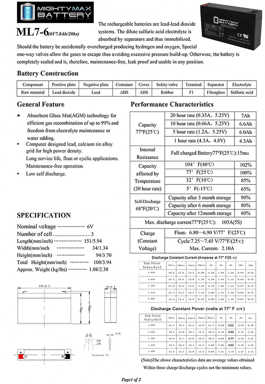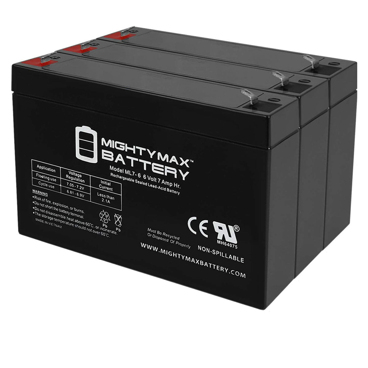 Delivering Power When You Need It, The Mighty Max Ml7-6 6 Volt 7 Ah Uses A State Of The Art, Heavy-Duty, Calcium-Alloy Grid That Provides Exceptional Performance And Service Life In Both Float And Cyclic Applicationsthe Ml7-6 Is An Absorbent Glass Mat (Agm) Technology With A Valve Regulated Design, That Can Be Used In Enclosed And Indoor Environments Without Leaking Or Maintenance, Providing A Superior Performance For Thousands Of Modelsmighty Max Sla Batteries Are Utilized In A Wide Variety Of Applications Including Consumer Electronics, Electric Vehicles, Engine Starters, Golf Carts, Hunting, Lawn And Garden Tools, Medical Mobility, Motorcycles, Power Sports, Portable Tools, Solar, Toys And Hobby, Access Control Devices, Emergency Lighting, Security And Morespecifications:&Nbspvoltage: 6 Voltamperage: 7 Ahchemistry: Sla, Agmterminal: F1Quantity: 3 Batteriesbattery Dimensions:&Nbsp594 In X 142 In X 394 Inweight: 243 Lbswarranty1 Year Genuine Mighty Max Battery Product