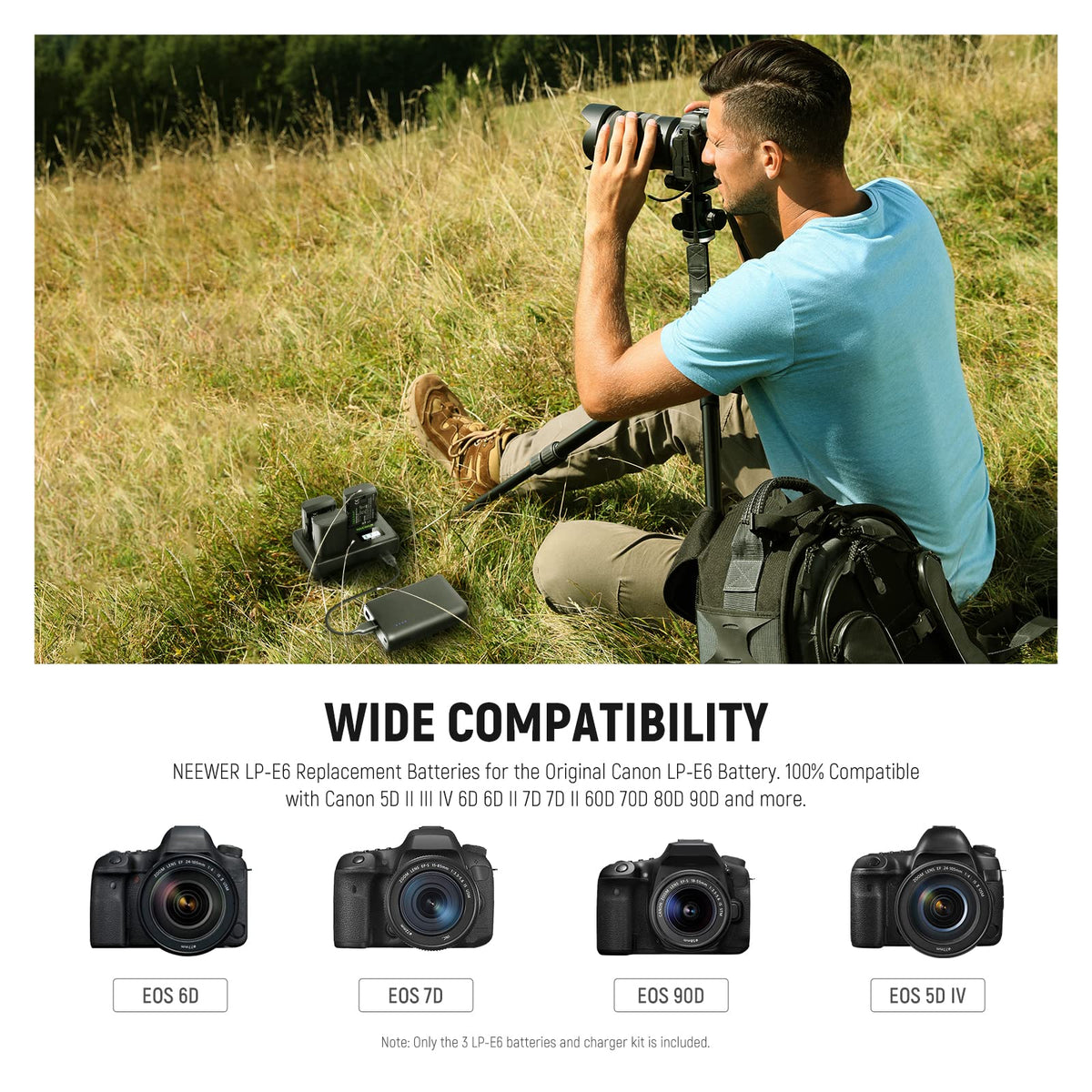 Neewer Lp-E6 Replacement Batteries Are Compatible With Canon Eos 5D Mark Ii 5D Mark Iii 5D Mark Iv 5D Sr 60D 60Da 6D 70D 7D Cameras And Other Devices Powered By Lp-E6 Battery. The Charger Is Compatible With Lp-E6 And Lp-E6Nh Li-Ion Battery Packs. Three 2000Mah Lp-E6 Batteries Offer Long Battery Life For Your Eos Camera And Are Easy To Carry In Your Bag. Charge 3 Batteries At The Same Time With The Triple-Slot Charger. Via The 5V 3A Usb Type-C Port, You Can Fully Charge 3 Batteries Together In 5 Hours. Usb Type-C And Usb-A Charging Ports Receive Power From Portable Chargers And Car Chargers For On-The-Go Charging. The Built-In Protection System Protects The Batteries From Overcharge, Over-Temperature, Over-Current, Over-Voltage, Electric Shocks, And Short Circuits. Specifications Lp-E6 Battery Voltage: 7.4V Battery Capacity: 14.8Wh, 2000Mah Battery Type: Li-Ion Rechargeable Battery Triple-Slot Charger Model: Tt-Lpe6 Input: 5V 3A Charging Time: 5 Hrs (3 Batteries), 4 Hrs (2 Batteries), 3 Hrs (1 Battery) Output: 8.4V 850Mah (X1) /650Mah (X2) / 450Mah (X3) Package Contents 3 X Lp-E6 Li-Ion Battery Pack 1 X Triple-Slot Battery Charger 1 X Usb Type-C Cable