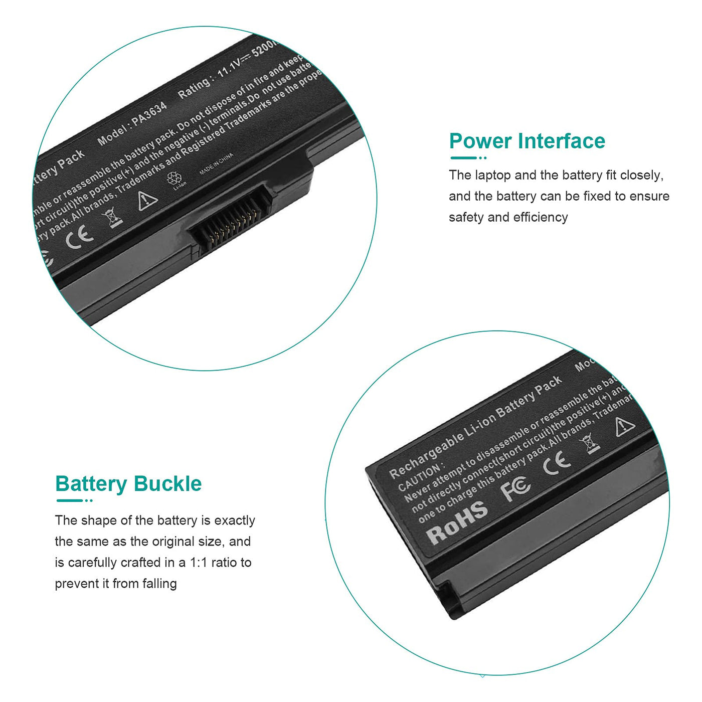 Q: What is the capacity and voltage of the PA3634U-1BAS battery?A: This battery has a capacity of 5200mAh and a voltage of 11.1V, providing reliable power for your laptop.