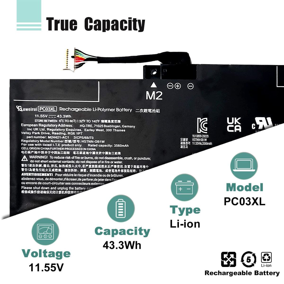 Welcome To Kappir: Dear Customers, Thank You For Your Interest And Support For Our Laptop Battery. We Are A Professional Laptop Battery Manufacturer, Dedicated To Manufacture And Provide Different Type High Quality Laptop Batteries For Our Customers. Thanks For Your Trust Again! Specification: Model:Pc03Xl Battery Type: Li-Ion Voltage: 11.55V Capacity: 43.3Wh 3560Mah Location Of Connector And Cable Length: Please Refer To The Battery Picture And Compare With Your Original Battery Replacement Part Number: Pc03Xl M24648-005 Hstnn-Ob1W M24421-271 M24421-Ac1 Pc03043Xl Tpn-Db0E Compatible Models: (Use ''Ctrl+F To Find Your Model Quickly'') Hp Pavilion X360 14 Series Hp Pavilion X360 15 Series Hp Pavilion X360 14-Dw Series: 14-Dw1023Dx 14-Dw0021Na 14-Dw0955Nd 14-Dw0158Ng 14-Dw1011Nl 14-Dw0097Nr 14-Dw0521Sa 14-Dw0136Tu 14-Dw1020Tu 14-Dw1021Tu 14-Dw1039Tu 14-Dw1040Tu 14-Dw1514Tu Hp Pavilion X360 14-Dy Series: 14-Dy0016Na 14-Dy0018Nf 14-Dy0008Nf 14-Dy0157Ng 14-Dy0243Ng 14-Dy0732Ng 14-Dy0002Nh 14-Dy0005Nh 14-Dy0003Ns 14-Dy0026T 14-Dy0018Tu 14-Dy0113Tu Hp Pavilion X360 14-Dh Series: 14-Dh1937Nd 14-Dh1153Ng 14-Dh1007Nl 14-Dh2075Nr 14-Dh0525Sa 14-Dh1177Tu 14-Dh1178Tu 14-Dh0006Tx 14-Dh1062Tx 14-Dh1038Tx 14-Dh2051Wm Hp Pavilion X360 14-Ba Series: 14-Ba110Nr 14-Ba190Nz Hp Pavilion X360 14-Cd Series: 14-Cd0004La 14-Cd0520Na 14-Cd0011Nr 14-Cd1075Nr 14-Cd0005Nx 14-Cd1511Sa 14-Cd0061Tu 14-Cd0081Tu 14-Cd1021Tu Hp Pavilion X360 15-Er Series: 15-Er0056Cl 15-Er0950Nd 15-Er0960Nd 15-Er0002Nf 15-Er0014Nf 15-Er0024Nf 15-Er0133Ng 15-Er0155Ng 15-Er0210Ng 15-Er0355Ng 15-Er0537Ng 15-Er0755Ng 15-Er0779Ng 15-Er0000Nh 15-Er0001Nh 15-Er0002Nh 15-Er0427No 15-Er0097Nr 15-Er0776Nz 15-Er0125Od 15-Er0006Ur Note: For More Accurate, Please Check The Part Number Of Your Original Battery Packing Included: 1* Pc03Xl Battery 1* Instruction Manual Warm Tips Before Purchase: Please Open Your Laptop Case, Check And Confirm Your Original Battery Model And Appearance, Compared With Our Battery Image, Make Sure That'S What You Need. Especially The Location Of The Connector And The Cable Length (Long Or Short) Battery Maintenance Method For Optimal Use: ? When You Get The New Battery, Discharge The Battery To 5% (Not 0%), Then Charge And Cycle 3-4 Times To Wake Up The New Battery ? The Important Point Is To Perform A Full Discharge And Charge Every Other Month To Extend The Battery Life ? Do Not Connect Adapter For A Long Time While Using The Battery. It May Damage The Battery ? Avoid Artificial Shocks, Disassembly, Crush Or Puncture. Do Not Dispose Of It In Fire Or Water