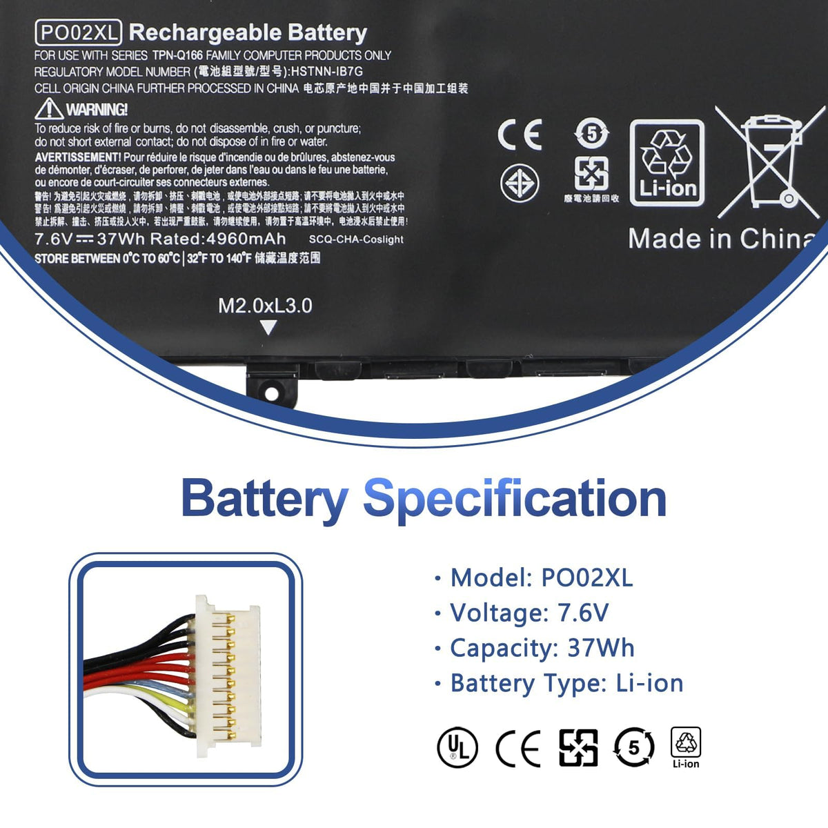 Q: Is the PO02XL battery safe and certified?A: Yes, the PO02XL battery is UL, CE, FCC, and RoHS certified, ensuring it meets strict safety and quality standards. Each battery undergoes rigorous testing to guarantee performance and safety for users.