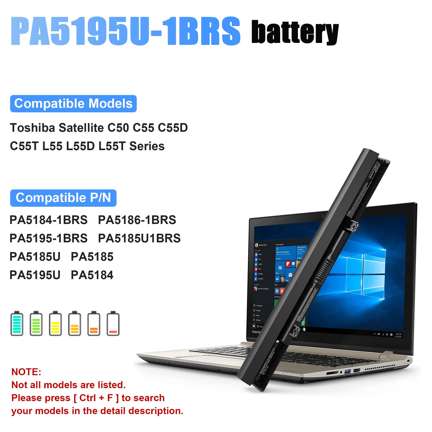 Note: If You Have Any Questions, You Can Contact Us At Any Time.Compatible Series:Toshiba Satellite C50-B C50D C50T C55 C55D C55L C55T L50 L55 L55D L55Dt L55T P55 P55T S40 S50T S55 S55T Seriespartial Models List(More Models Are Not Listed):C50-B C50-B-02Y C50-B031D C50-B03E C50-B-14D C50-B-14Z C50-B-Iil C50D-B C50T-B C55 C55-5241 C55-5352 C55-A-1D5 C55-A-1N0 C55-A5105 C55-A5300 C55-B C55-B5100 C55-B5101 C55-B5115Km C55-B5116Km C55-B5117Km C55-B5142 C55-B5161 C55-B5166Km C55-B5167Km C55-B5170 C55-B5196 C55-B5200 C55-B5201 C55-B5202 C55-B5270 C55-B5272 C55-B5287 C55-B5292 C55-B5293 C55-B5295 C55-B5296 C55-B5298 C55-B5299 C55-B5300 C55-B5302 C55-B5353 C55-B5355 C55-B5362 C55-C5123 C55-C5135 C55-C5201K C55-C5202K C55-C5206S C55-C5207S C55-C5208K C55-C5212K C55-C5213K C55-C5219K C55-C5241 C55D C55D-A-13U C55D-A5240Nr C55D-A5304 C55D-B C55D-B5102 C55D-B5160 C55D-B5203 C55D-B5206 C55D-B5212 C55D-B5214 C55D-B5219 C55D-B5221K C55D-B5241 C55D-B5242 C55D-B5244 C55D-B5308 C55D-B5310 C55D-B5319 C55L C55T C55T-B C55T-B5102 C55T-B5109 C55T-B5110 C55T-B5230 C55T-B5330 C55T-B5349 C55T-C5300 E45-B4100 L50-B L55 L55-B L55-B5163Rm L55-B5176Wm L55-B5177Sm L55-B5178Rm L55-B5179Sm L55-B5181Sm L55-B5184Rm L55-B5184Wm L55-B5191Sm L55-B5192Sm L55-B5237 L55-B5254 L55-B5255 L55-B5267 L55-B5276 L55-B5284 L55-B5288 L55-B5294 L55-B5338 L55-B5357 L55-B5394 L55-B5396 L55-C5183 L55-C5203R L55-C5211R L55-C5220S L55-C5272 L55-C5335S L55-C5336S L55-C5340 L55-C5346Bl L55-C5346Br L55-C5346Pl L55D L55D-B5162Rm L55D-B5238 L55D-B5260Rm L55D-B5320 L55D-B5364 L55D-B5380Rm L55D-C5204R L55Dt-B5144 L55Dt-B5175Sm L55Dt-B5268Rm L55Dt-B5380Rm L55Dt-C5205S L55Dt-C5209S L55Dt-C5238 L55T L55T-B5164Wm L55T-B5172Sm L55T-B5188 L55T-B5257W L55T-B5271 L55T-B5278 L55T-B5330 L55T-B5334 L55T-B5382Sm S55-B5203 S55-C5247 S55-B5280 S55-B5289 S55-B5292 S55-C5274 S55T S55T-B5152 S55T-B5233 S55T-B5234 S55T-B5273Compatible Pn:Pa5184U-1Brs Pa5185U-1Brs Pa5186U-1Brs Pa5195U-1Brs