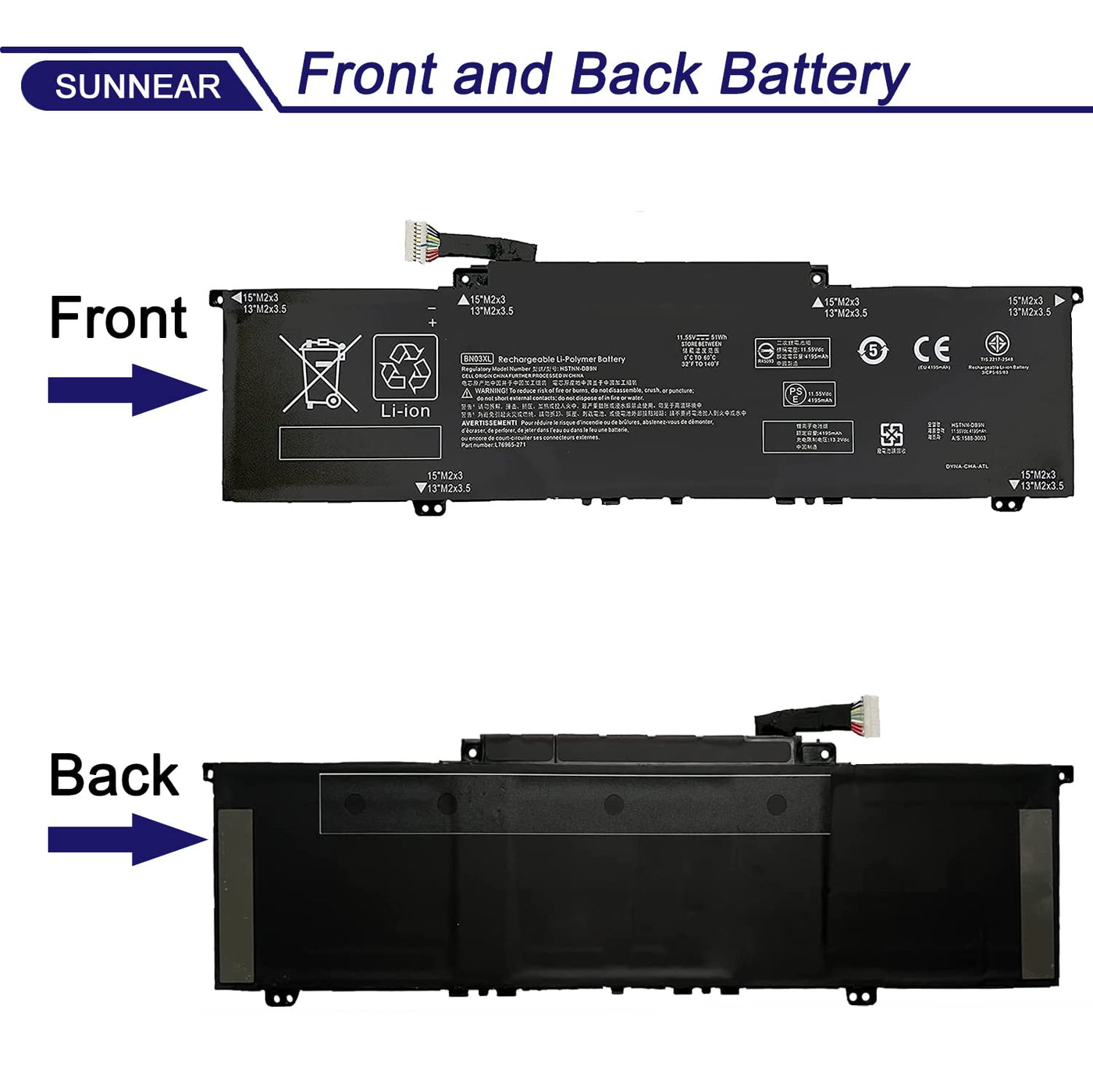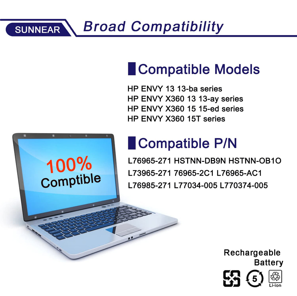 *About Sunnear: Sunnear Focus On Laptop Batteries, To Each Of Our Customers With High-Quality Laptop Battery. The Satisfaction From Customer Is Our Forever Target. We Have A Professional Team, Focus Our Major And Value Every Client. Thanks For Your Purchase! *Specification: *Voltage: 11.55V. *Capacity: 51Wh /4195Mah. *Compatible Part Number: Bn03Xl L76965-271 Hstnn-Db9N Hstnn-Ob1O L73965-271 L76965-2C1 L76965-Ac1 L76985-271 L77034-005 L770374-005. *Fit For:(Use ''Ctrl'' + ''F'' To Find Your Models Quickly) 1.Hp Envy 13 13-Ba0003Nu 13-Ba0004Nu 13-Ba0010Nr Series.2.Hp Envy X360 15 2020 Series. 3.Hp Envy X360 13-Ar0082Au 13-Ay0000 13-Ay0001Nc 13-Ay0002Nd 13-Ay0003Nf 13-Ay0004Nc 13-Ay0007Ca 13-Ay0008Na 13-Ay0009Na 13-Ay0010Nr 13-Ay0021Nf 13-Ay0021Nr 13-Ay0055Cl 13-Ay0065Au 13-Ay0075Nr 13-Ay0360Ng 13-Ay0378Ng 15-Ed0000 15-Ed0007Na 15-Ed0257Ng 15T-Ed000 15-Ed0006Tx 15-Ed0009Tx Series. 4.Hp Envy X360 15M-Ee 15M-Ee0013Dx 15M-Ee0023Dx Series. *Package Included : 1X Bn03Xl Battery. *Worry-Free Warranty: At Sunnear, We Believe In Our Battery. That'S Why We Support 30 Days Of Refund For 12 Months Warranty, And Provide Friendly Customer Service, Easy To Support. *For Optimal Use Battery: ?Discharge The New Battery To 5% (Not 0%), Then Charge And Cycle 3-4 Times To Wake Up The New Battery. ?The Important Point Is To Perform A Full Discharge Charge Every Other Month To Extend Battery Life. ?When Using External Power For A Long Time, It Is Recommended To Remove The Battery To Avoid Affecting Battery Life. ?Avoid Artificial Shocks, Disassembly, Fall, Heat Or Short Circuit. ?Avoid Using The Battery In An Environment Where The Temperature Is Too High Or Too Low.