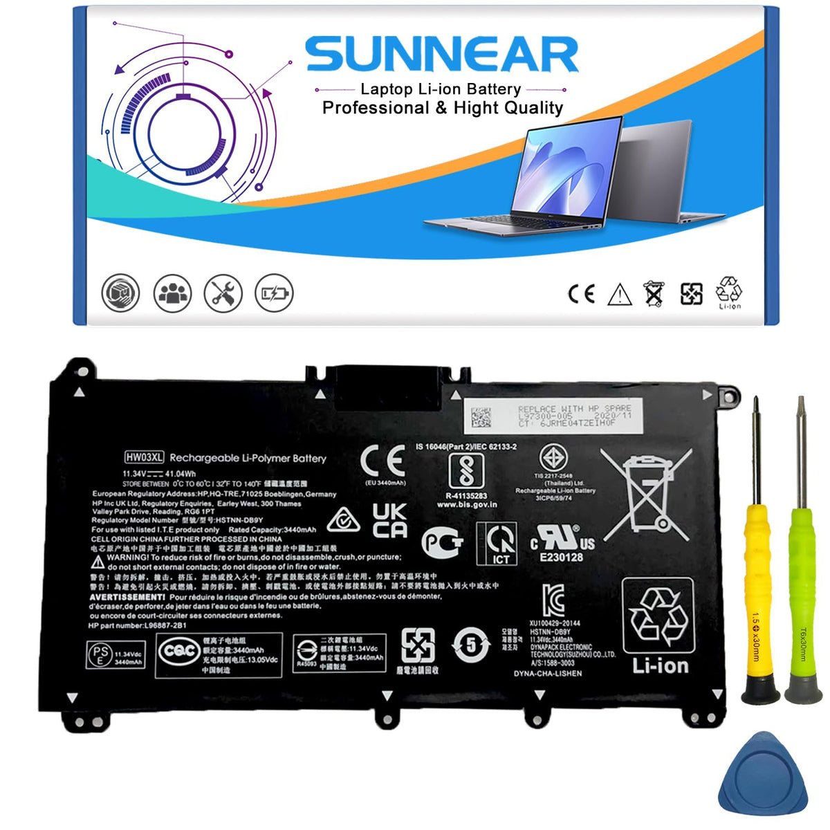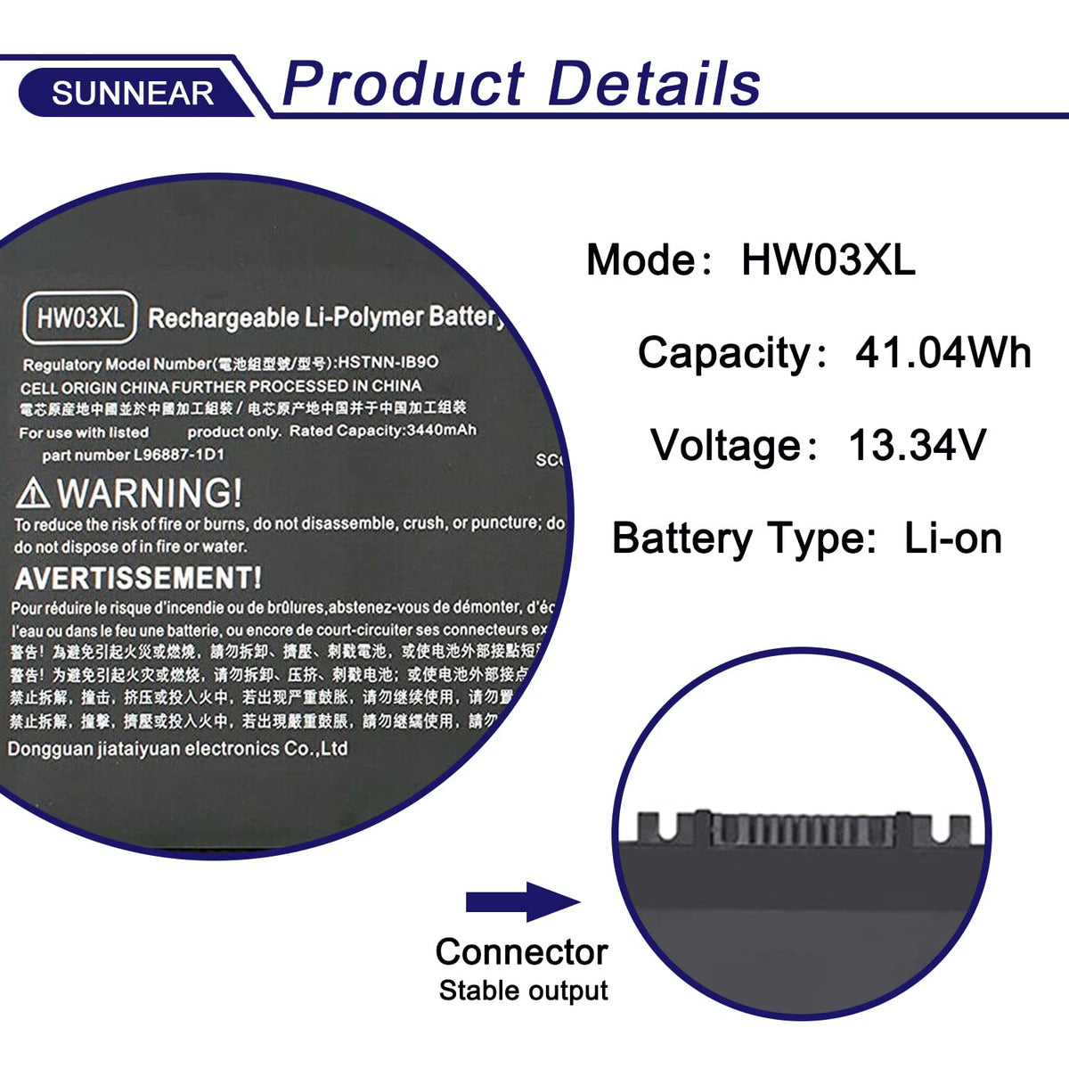 *About Sunnear: Sunnear Focus On Laptop Batteries, To Each Of Our Customers With High-Quality Laptop Battery. The Satisfaction From Customer Is Our Forever Target. We Have A Professional Team, Focus Our Major And Value Every Client. Thanks For Your Purchase! *Specification: *Voltage: 11.34V. *Capacity: 41.04Wh /3440Mah. *Compatible Part Number: Hw03Xl Hwo3Xl Hw03041Xl Hstnn-Ib90 Hstnn-Ib9O Hstnn-Lb8U Hstnn-Ob2A L96887-1D1 L96887-421 L96887-Ac1 L97300-005. *Fit For:(Use ''Ctrl'' + ''F'' To Find Your Models Quickly) 1.Hp Pavilion 15-Eg0000 15-Eg0Xxx Series: 15-Eg0073Cl 15-Eg0048Nr 15-Eg1025Cl 15-Eg1053Cl 15-Eg1073Cl 15-Eg0021Nr 15-Eg0027Od 15- Eg0051Cl 15-Eg0055Nr 15-Eg0065St 15-Eg0067St 15-Eg0070Wm 15-Eg0053Cl 15- Eg0074Wm 15-Eg0025Cl 15-Eg0079Nr 15-Eg0074Nr 15-Eg0025Nr And More. .2.Hp 240 G9, Hp 245 G9, Hp 250 G9, Hp 255 G8, Hp 255 G9, Hp 470 G8 And More.. 3.Hp 17-Cp0001Ca 17-Cp0001Ds 17-Cp0002Ds 17-Cp0003Ds 17-Cp0004Ds 17-Cp0005Ds 17-Cp0006Ds 17-Cp0007Ca 17-Cp0007Ds 17-Cp0008Ds 17-Cp0009Ds 17-Cp0010Ca 17-Cp0010Ds 17-Cp0010Nr 17-Cp0011Ds 17-Cp0013Dx 17-Cp0025Cl 17-Cp0035Cl 17-Cp0042Ca 17-Cp0044Nr 17-Cp0047Nr 17-Cp0048Nr 17-Cp0056Nr 17-Cp0076Nr 17-Cp0096Nr 17-Cp0097Nr 17-Cp0124Od 17-Cp0177Ng 17-Cp0196Nr 17-Cp0P0Xxx 17Z-Cp000 And More. *Package Included : 1X Hw03Xl Battery. *Worry-Free Warranty: At Sunnear, We Believe In Our Battery. That'S Why We Support 30 Days Of Refund For 12 Months Warranty, And Provide Friendly Customer Service, Easy To Support. *For Optimal Use Battery: ?Discharge The New Battery To 5% (Not 0%), Then Charge And Cycle 3-4 Times To Wake Up The New Battery. ?The Important Point Is To Perform A Full Discharge Charge Every Other Month To Extend Battery Life. ?When Using External Power For A Long Time, It Is Recommended To Remove The Battery To Avoid Affecting Battery Life. ?Avoid Artificial Shocks, Disassembly, Fall, Heat Or Short Circuit. ?Avoid Using The Battery In An Environment Where The Temperature Is Too High Or Too Low.