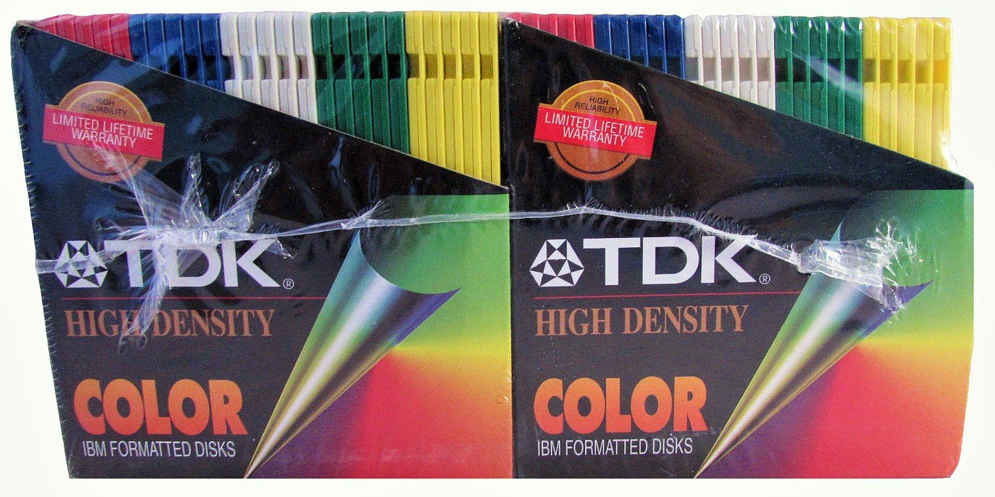 Q: What colors are available for the TDK High Density floppy disks?A: These disks come in several vibrant colors including yellow, green, white, navy, and red, allowing for easy organization and color-coding of your files.
