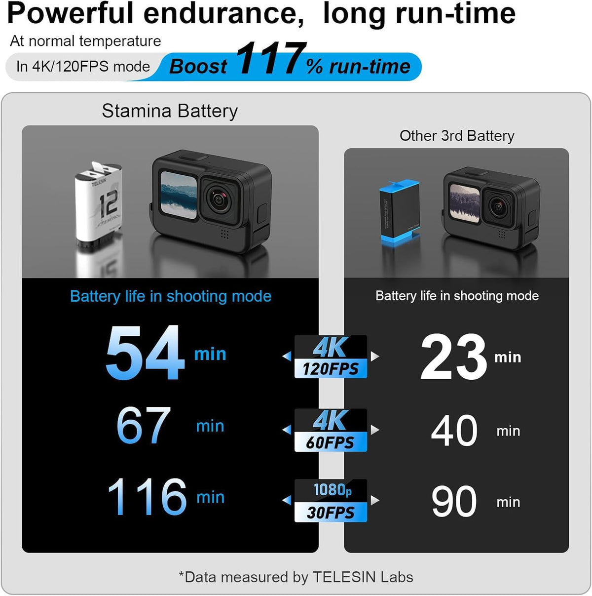Q: What makes the TELESIN Enduro Battery a better choice than regular batteries?A: The TELESIN Enduro Battery lasts 96% longer than regular batteries and maintains performance in both high and low temperatures. It also offers a stable power display with no cliff jumps in power, ensuring a reliable shooting experience compared to older battery versions.