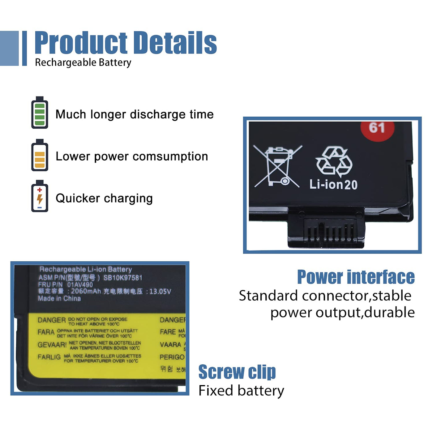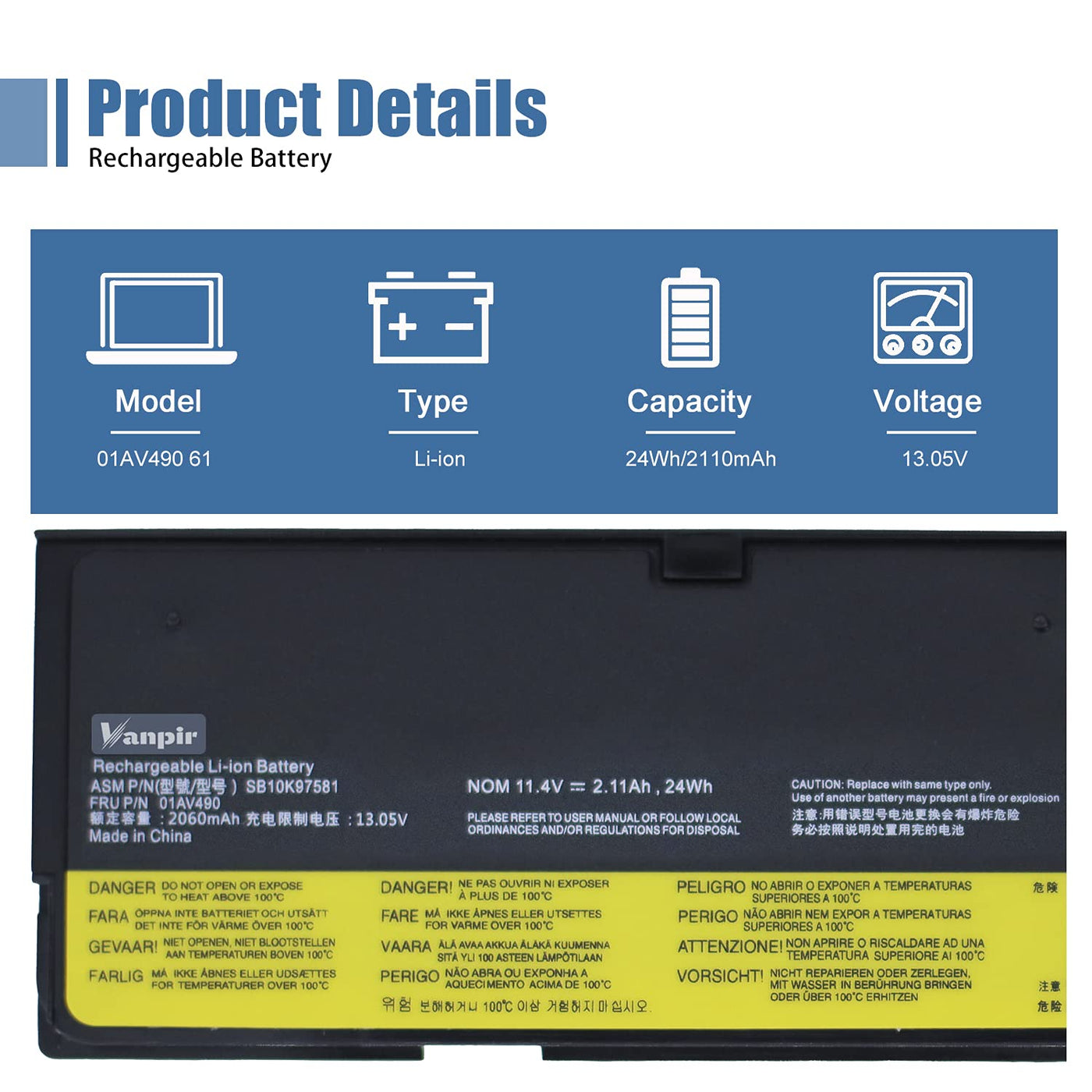 Welcome To Vanpir: We Are A Professional Laptop Battery Manufacturer, Dedicated To Manufacture And Provide High Quality Different Type Laptop Batteries For Our Customer. Specification: Model:01Av490 (61) Battery Type: Li-Ion Voltage: 11.4V Capacity: 24Wh 1950Mah Location Of Connector And Cable Length: Please Refer To The Battery Picture And Compare With Your Original Battery Replacement Part Number: 61 01Av490 Sb10K97580 01Av452 Sb10K97597 01Av423 4X50M08810 01Av422 Sb10K97579 01Av424 Sb10K97581 Compatible Models: (Use ''Ctrl+F To Find Your Model Quickly'') Lenovo Thinkpad T470 T570 T480 T580 A485 A475 P51S P52S Tp25 Series Notebook. Note: For More Accurate, Please Check The Part Number Of Your Original Battery Packing Included: 1* 01Av490 (61) Battery 1* Instruction Manual Warm Tips Before Purchase: Please Open Your Laptop Case, Check And Confirm Your Original Battery Model And Appearance, Compared With Our Battery Image, Make Sure That'S What You Need. Especially The Location Of The Connector And The Cable Length (Long Or Short) Battery Maintenance Method For Optimal Use: ? When You Get The New Battery, Discharge The Battery To 5% (Not 0%), Then Charge And Cycle 3-4 Times To Wake Up The New Battery ? The Important Point Is To Perform A Full Discharge And Charge Every Other Month To Extend The Battery Life ? Do Not Connect Adapter For A Long Time While Using The Battery. It May Damage The Battery ? Avoid Artificial Shocks, Disassembly, Crush Or Puncture. Do Not Dispose Of It In Fire Or Water