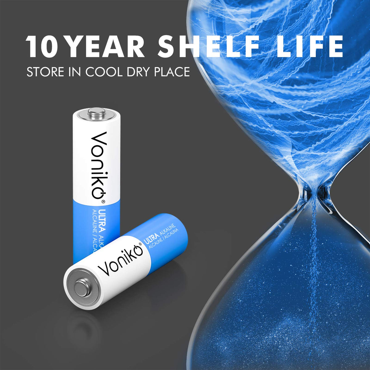 Q: How long do Voniko AA batteries last?A: Voniko AA batteries offer an ultra-long-lasting performance, typically lasting 6-9 times longer than standard carbon batteries. They are designed to provide reliable power for up to 10 years when stored properly.