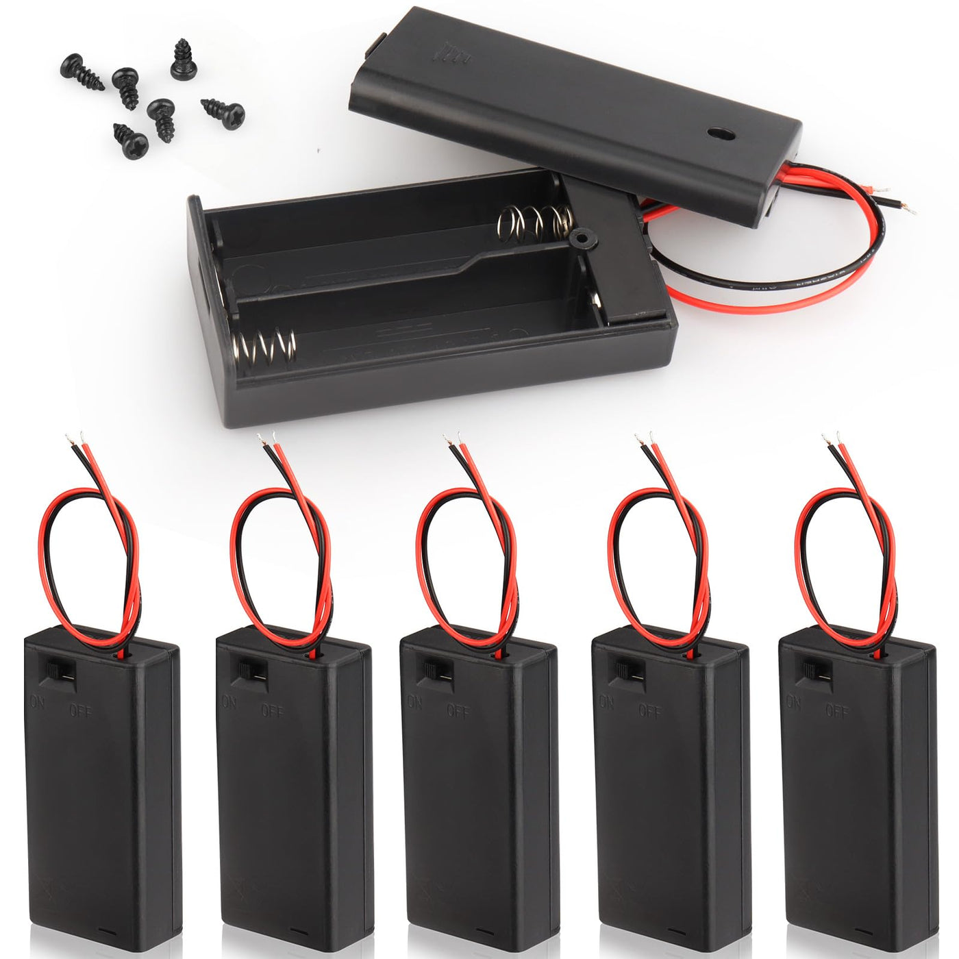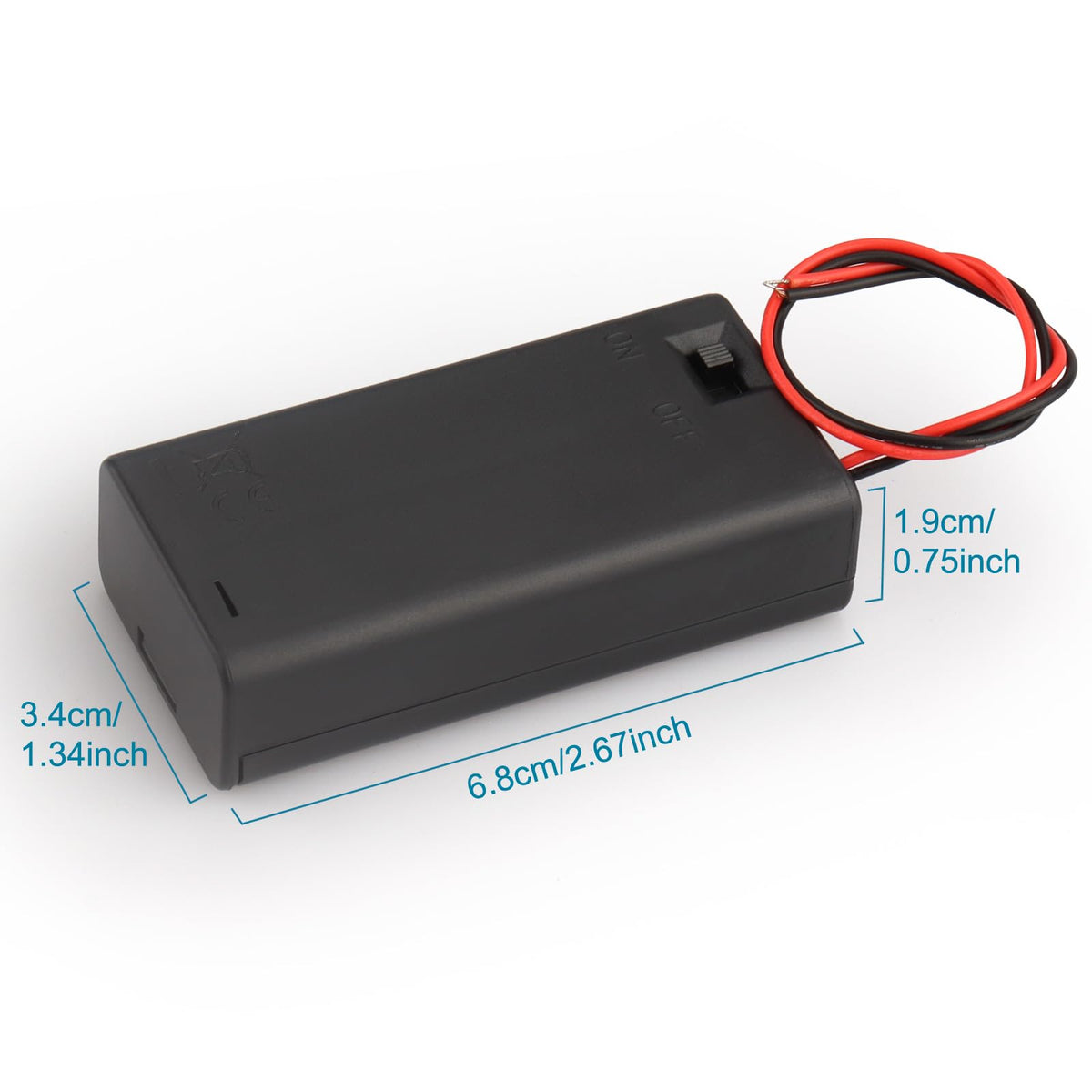 Specification: Battery Type: 2 Aa Batteries, 2X 1.5V Aa Batteries Battery Holder Switch Function: Aa Battery Holder With On/Off Switch Battery Holder Wire Leads: 2 Aa Battery Holder With Black And Red Wire And Wire Leads, With Tinned Wire End Battery Holder Wire Length: 5.7''/14.5Cm Battery Holder Cable Color: Red And Black Battery Case Dimensions: 2.7'' X 1.34'' X 0.75''/6.88Cm X 3.4Cm X 1.9Cm(L*W*H) Battery Box Weight: 0.67Oz/19G Battery Box Color: Black Material: Plastic Abs Package Contents: 6X 2 Aa Battery Holder With Switch Leads 6X Screws