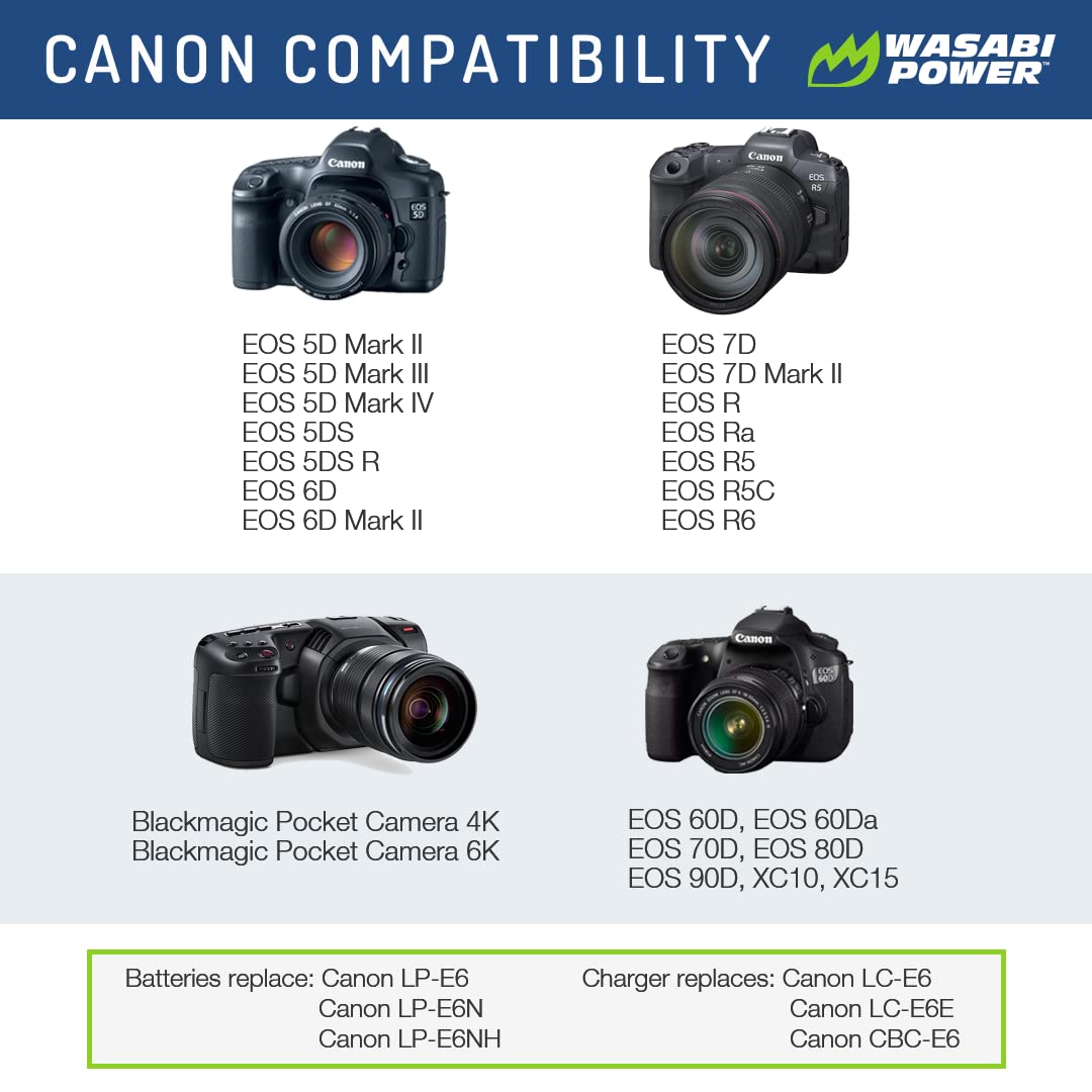 This Wasabi Power Lpe6 Kit Includes 4 Batteries And One Dual Usb Charger. All Items Meet Or Exceed Oem Standards And Come With A 3-Year Manufacturer Warranty. Need A Canon Lp-E6N Battery Pack? Grab A Wasabi Power Lpe6 Battery For Your Canon Eos R Today! Batteries Replace: Canon Lp-E6, Lp-E6N Charger Replaces: Canon Lc-E6, Lc-E6E, Cbc-E6. Compatible With: Replacement For Blackmagic Design Pocket Cinema Camera 4K & 6K Canon Eos 5D Mark Ii Canon Eos 5D Mark Iii Canon Eos 5D Mark Iv Canon Eos 5Ds Canon Eos 5Ds R Canon Eos 6D Canon Eos 6D Mark Ii Canon Eos 7D Canon Eos 7D Mark Ii Canon Eos 60D Canon Eos 60Da Canon Eos 70D Canon Eos 80D Canon Eos 90D Canon Eos R Canon Eos R5 Canon Eos R5C Canon Eos R6 Canon Eos Ra Canon Xc10 Canon Xc15 ** Edelkrone Dollyplus Edelkrone Headone V2 **Edelkrone Headplus ** Edelkrone Headplus V2 ** Edelkrone Jibone ** Edelkrone Jibone V2 ** Edelkrone Motor Module For Sliderplus Yongnuo Yn433