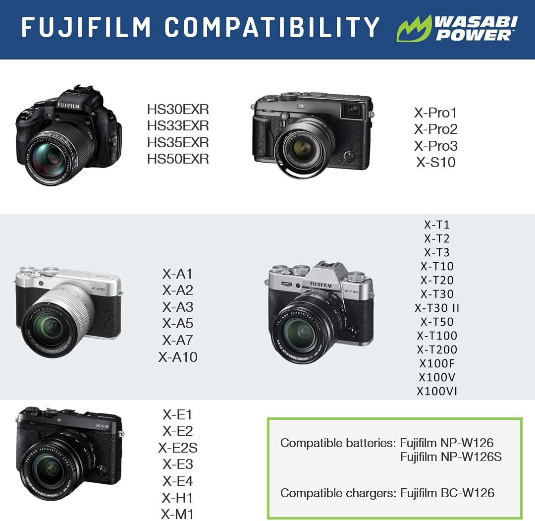 Q: What cameras are compatible with the Wasabi Power NPW126 battery?A: The Wasabi Power NPW126 battery is compatible with a range of Fujifilm cameras including the X-T100, X-T200, X-S10, X-A3, X-A5, X-E2S, X-E3, X-H1, and many more models that use NP-W126 or NP-W126S batteries.