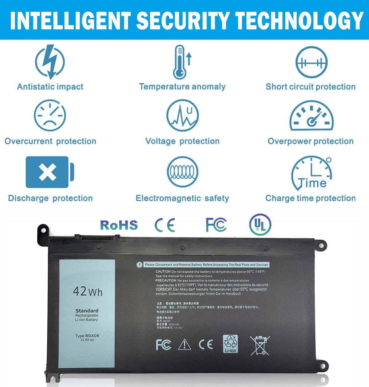 Q: Are there any safety features in the WDX0R battery?A: Yes, the WDX0R battery is equipped with multiple safety features including short circuit protection, overheat protection, and overload protection. It is UL, CE, FCC, and RoHS certified, ensuring high safety standards.