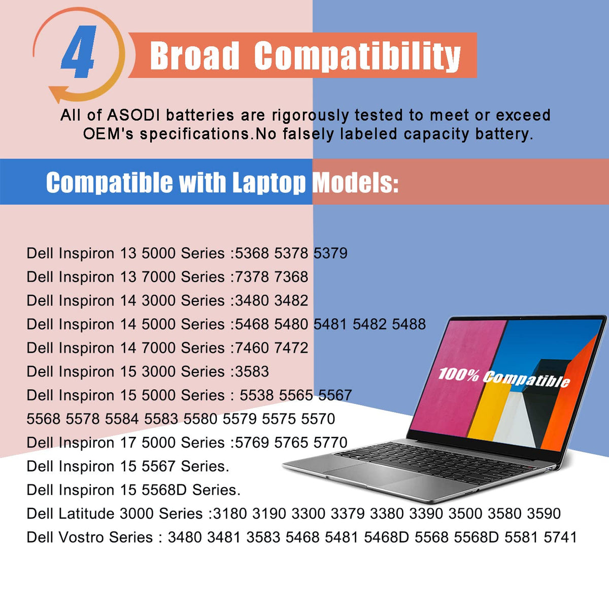 Specifications: .Battery Type: Rechargeable Li-Ion Battery .Model: Wdx0R .Voltage: 11.4V .Capatity: 42Wh/3500Mah .Compatible Models (Use ''Ctrl+F To Find Your Model Quickly'') For Dell Inspiron 13 5000 Series :5368 5378 5379 For Dell Inspiron 13 7000 Series :7378 7368 For Dell Inspiron 14 3000 Series :3480 3482 For Dell Inspiron 14 5000 Series :5468 5480 5481 5482 5488 For Dell Inspiron 14 7000 Series :7460 7472 For Dell Inspiron 15 3000 Series :3583 For Dell Inspiron 15 5000 Series : 5538 5565 5567 5568 5578 5584 5583 5580 5579 5575 5570 For Dell Inspiron 17 5000 Series :5769 5765 5770 For Dell Inspiron 15 5567 Series : 15-5567-D1745L 15-5567-D1745A 15-5567-D1725A 15-5567-D1625R 15-5567-D1625L 15-5567-D1625A 15-5567-D1545A 15-5567-D1525R 15-5567-D1525A 15Mf-1508Ta 15Mf-Pro-1508T For Dell Inspiron 15 5568D Series : 15-5568D-1325S 15-5568D-1525L 15-5568D-1845S 15-5568D-1645L 15-5568D-1745S 15-5568D-1525S 15-5568D-1625S For Dell Latitude 3000 Series :3180 3190 3300 3379 3380 3390 3500 3580 3590 For Dell Vostro Series : 3480 3481 3583 5468 5481 5468D 5568 5568D 5581 5741 .Compatible Part Numbers: Wdx0R / 0Wdx0R / Wdxor 3Crh3 / T2Jx4 Yrdd6 / Fc92N C4Hcw / 0C4Hcw Y3F7Y / 0Y3F7Y Fw8Kr / Cymgm / 8Yprw P69G / P69G001 P58F / P58F001 .Package Included: 1X Wdx0R Battery One Set Of 5 In 1 Screwdrivers Tool 1X Instruction Manual