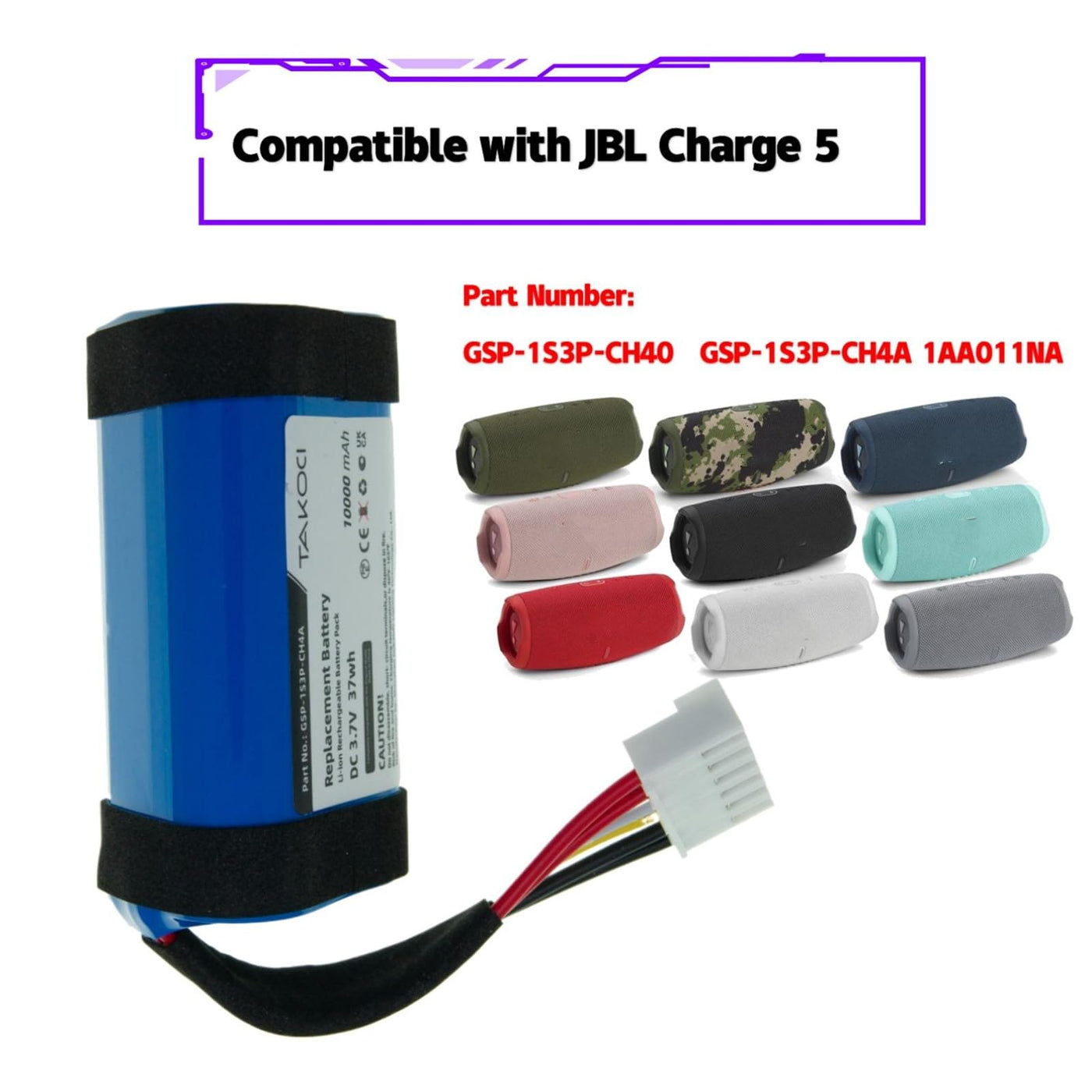 Q: Is this battery compatible with the JBL Charge 5?A: Yes, this 10000mAh battery is specifically designed for the JBL Charge 5 and is compatible with part numbers GSP-1S3P-CH4A and 1AA011NA.