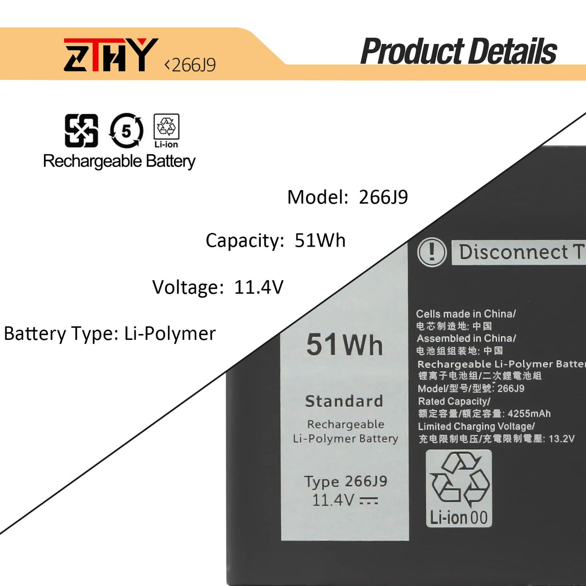 Q: How long does the ZTHY 266J9 battery last on a single charge?A: The ZTHY 266J9 battery has a capacity of 51Wh, providing substantial power for your laptop. Depending on your usage, you can expect it to last several hours on a single charge. Battery life may vary based on the applications you run and the laptop settings.