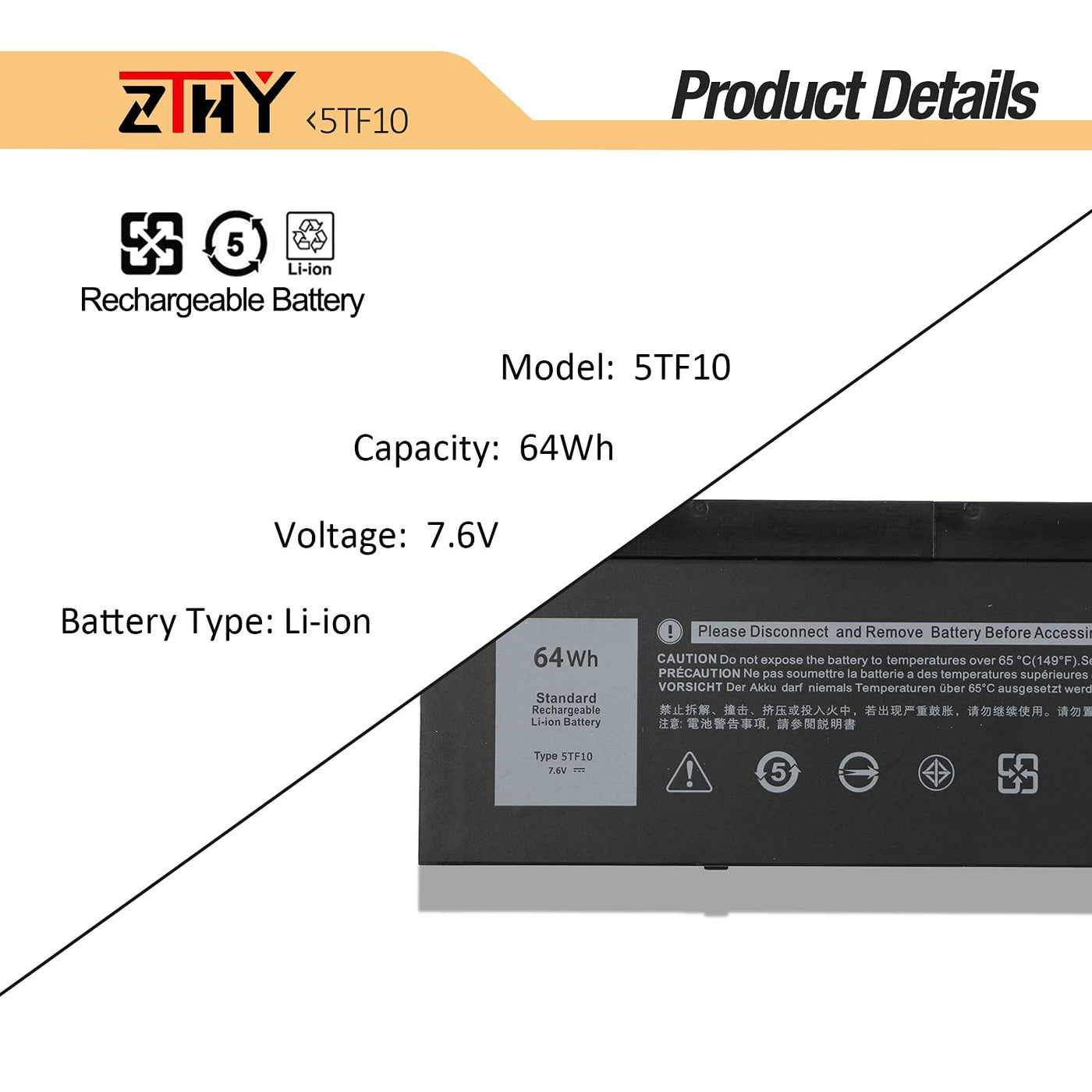 Q: What are the specifications of the ZTHY 5TF10 battery?A: The ZTHY 5TF10 battery has a voltage of 7.6V, a capacity of 64Wh, and is a 4-cell Li-ion battery. It is designed for up to 500 recharge cycles over its lifespan, ensuring long-lasting performance.