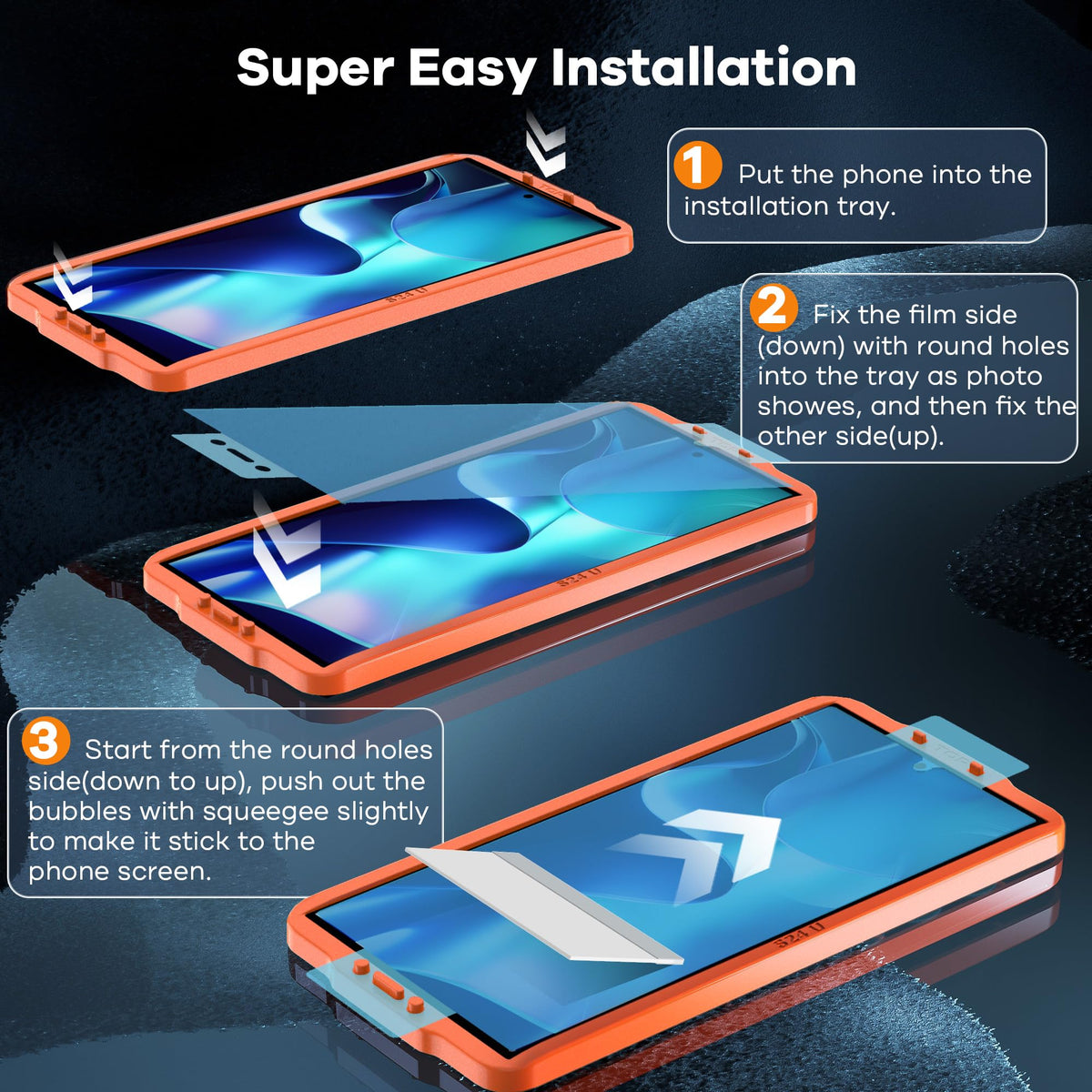 Q: What does the package include?A: The package contains 4 screen protectors for the Galaxy S24 Ultra, along with 4 wipes, 4 dust removers, 1 installation guide, 1 installation tool, 2 cleaning cloths, and 1 non-slip mat.