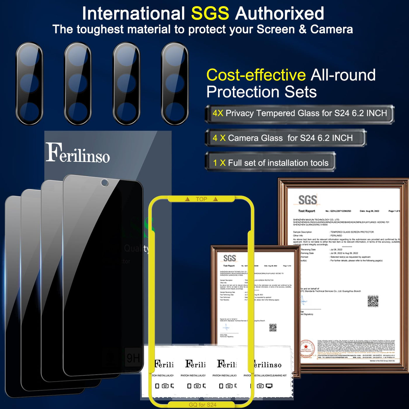 Ferilinso 4 Pack Privacy Screen Protector For Samsung Galaxy S24 With 4 Pack Tempered Glass Camera Lens Protector Phone Case Fri